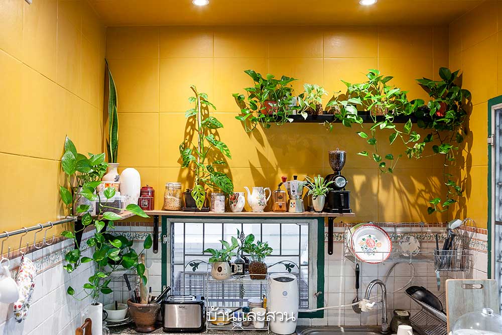 “น้ำผึ้งย้ายเข้ามาในบ้านหลังนี้ได้ประมาณ 2 ปี ตอนนั้นก็เริ่มปลูกต้นไม้มาเรื่อย ๆ มีคนบอกว่าเราปลูกเก่ง แต่จริง ๆ ไม่ใช่ ซื้อเก่งมากกว่า (หัวเราะ) ตอนเห็นมุมนี้ที่เป็นชั้นลอยก็คิดเลยว่าจะนำต้นไม้มาลง เพราะอยู่ในทิศตะวันออก มีแสงเช้าส่องเข้าทางหน้าต่างตั้งแต่เช้า ส่วนแสงบ่ายก็จะตกที่มุมหน้าบ้าน ต้นไม้มุมนี้ก็จะได้รับแสงไปในตัว สมัยก่อนคุณพ่อคุณแม่คุณสมเกียรติมักใช้มุมนี้เป็นที่รีดผ้า ตากผ้า เพราะมีแสงแดดส่องถึง อากาศถ่ายเทดี พอน้ำผึ้งมาเห็นก็ชอบเลยค่ะ แสงที่ส่องผ่านหน้าต่าง ไม่ใช่แสงแดดโดยตรง เหมาะกับต้นไม้ที่เราปลูกในบ้านมาก ๆ”