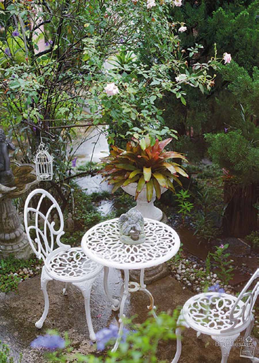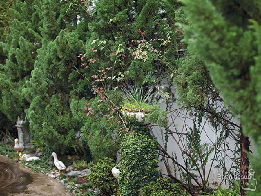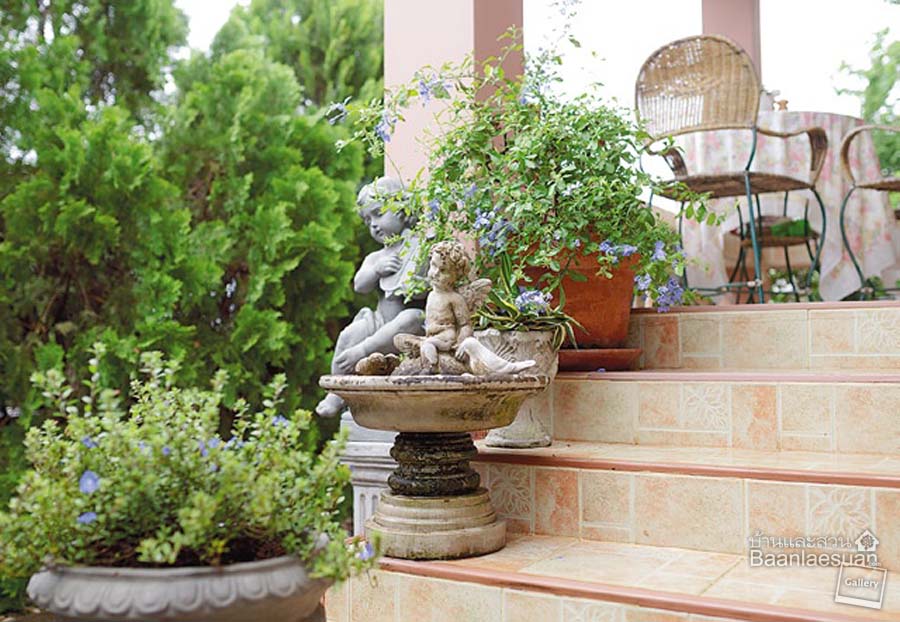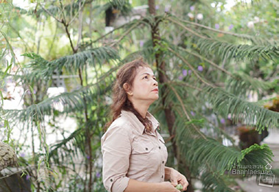 “พี่ชอบแต่งบ้านมาตั้งแต่เด็ก เพราะดูจากหนังสือแล้วเรามีความฝันว่าถ้ามีบ้านก็จะจัดสวนแบบนี้ อีกอย่างเคยไปเที่ยวแคนาดา เห็นบ้านเล็กบ้านน้อยในประเทศเขา คุณภาพชีวิตเขาดี ขนาดบ้านหลังเล็กๆ สวนยังสวยมาก พี่จัดสวนนี้โดยอิงรูปแบบสวนอิงลิชคันทรี ดูอบอุ่นและน่ารักสไตล์ผู้หญิง มีเพิ่มต้นไม้ใหญ่คือหลิวลู่ลม ซื้อมาตั้งแต่ต้นเล็กๆ เส้นผ่านศูนย์กลางสองนิ้วเท่านั้นเอง ปลูกเป็นไม้ประธานของสวน ดูอ่อนช้อย อ่อนหวาน แล้วเราก็ชอบความพลิ้วไหวของต้น ทำให้สวนดูมีชีวิตชีวา”