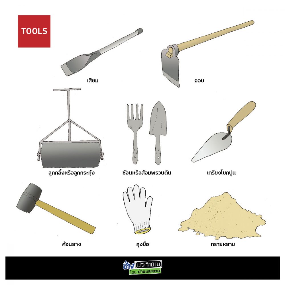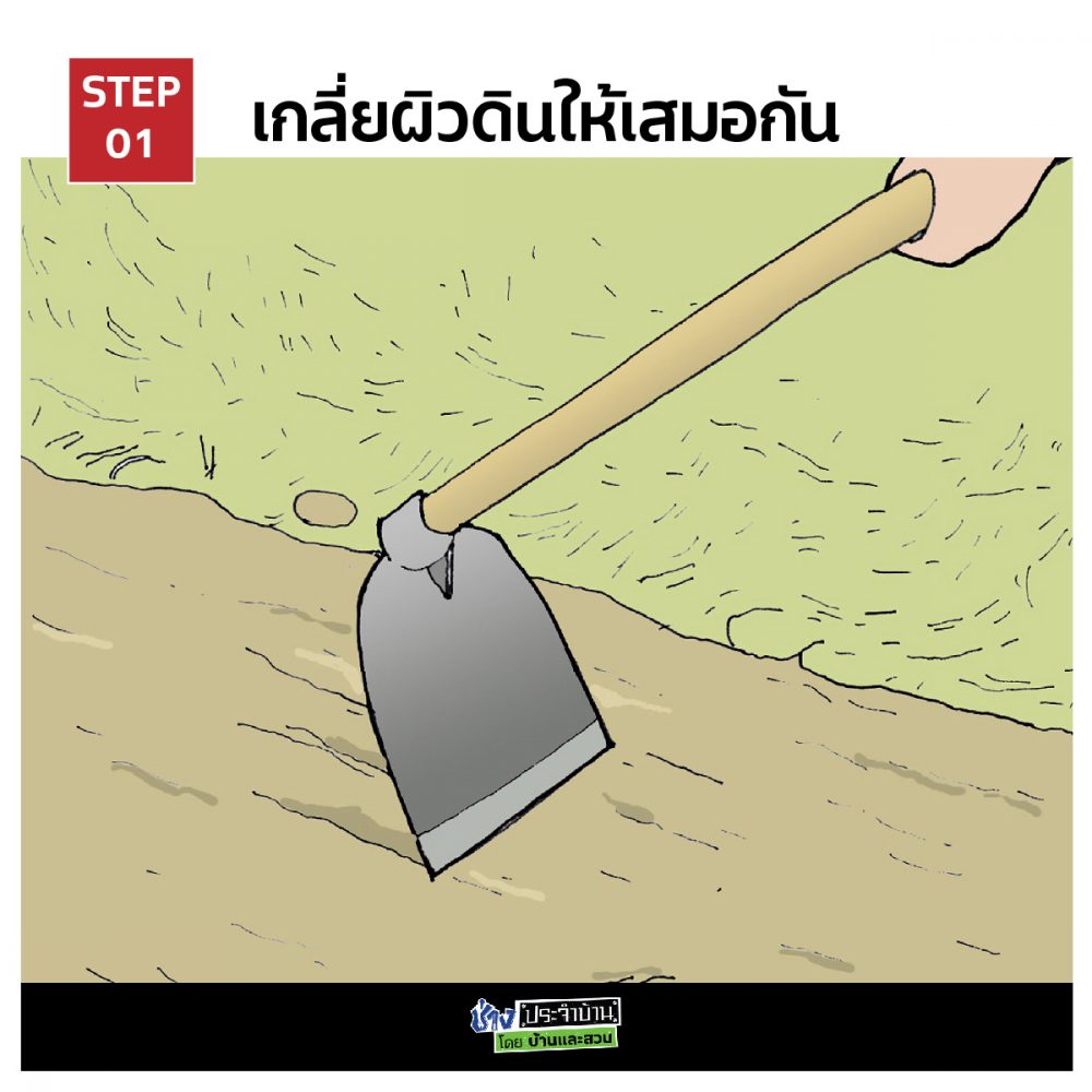 1. ใช้จอบหรือเสียม ค่อยๆ ถากผิวดินแล้วเกลี่ยให้เสมอกัน และเก็บวัชพืชรวมถึงเศษวัสดุต่างๆ เช่น ก้อนหิน ถุงพลาสติกออกจากดิน