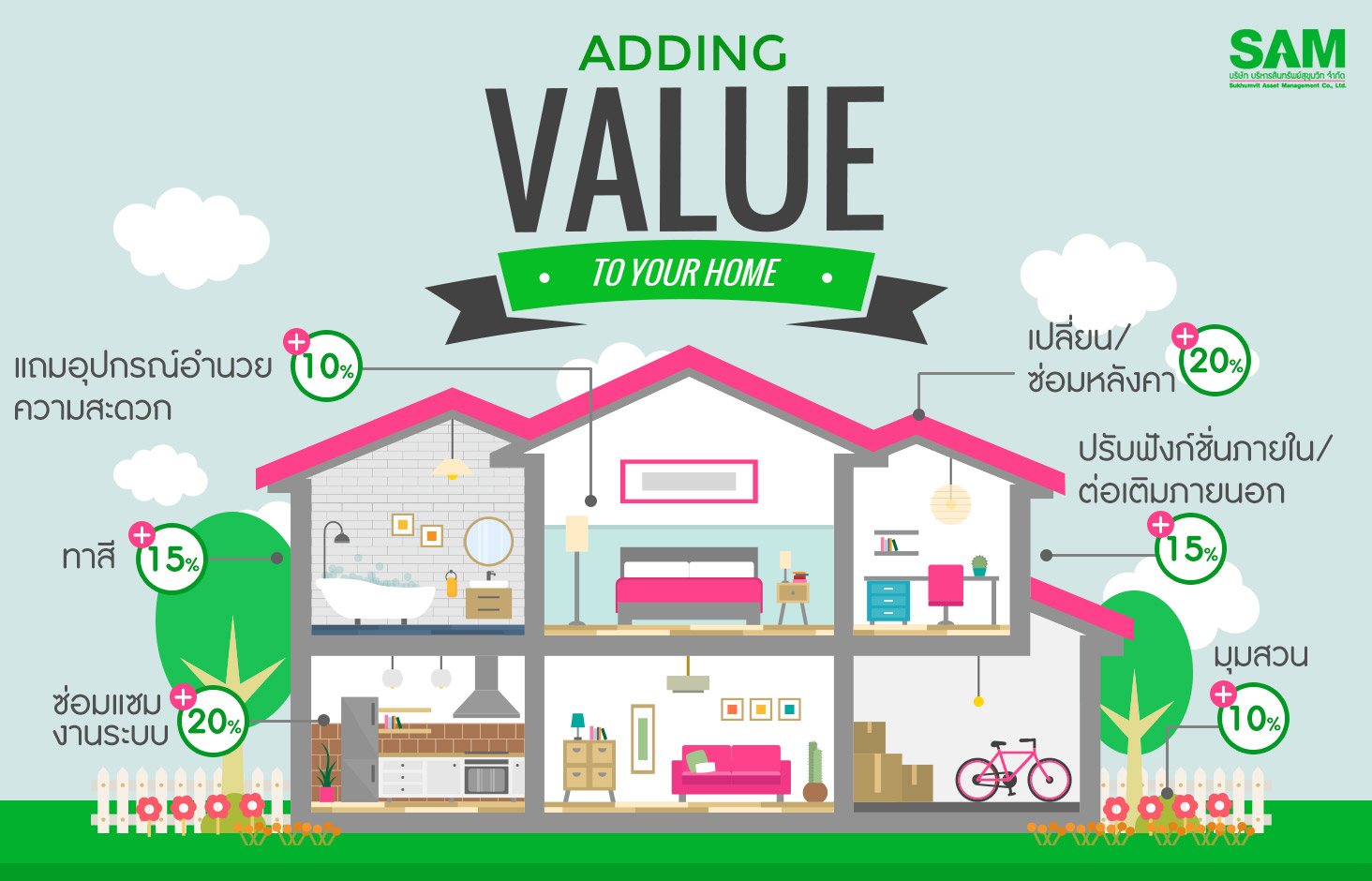 คุณรู้หรือไม่คะว่า .. ไม่ว่าจะเป็นการซ่อม เปลี่ยน ปรับ หรือแถมอุปกรณ์อำนวยความสะดวกในบ้านต่างก็ช่วยอัพ Value เพิ่มราคาให้บ้านมือ 2 ของคุณได้ เรามีภาพประกอบแบบ INFOGRAPHIC ง่ายๆมาให้คุณเลือกเพิ่มมูลค่าเทียบเป็นเปอร์เซ็นต์ให้เห็นกันด้านล่างนี้เลย!