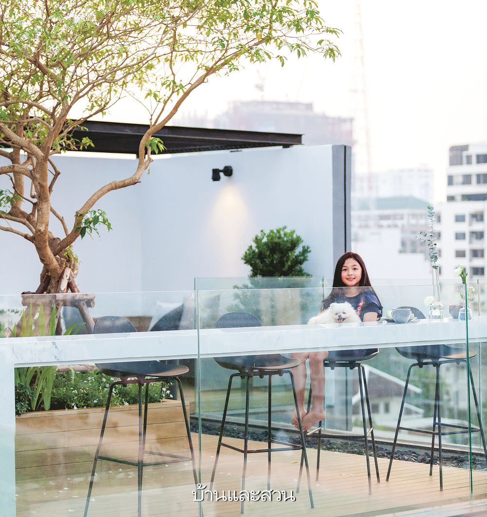 บรรยากาศเย็นสบาย มีลมอ่อนๆพัดตลอดเวลาบนดาดฟ้าบ้าน 6 ชั้นของ ครอบครัวอัศวโภคี ในย่านอารีย์สวนสไตล์โมเดิร์นที่จัดองค์ประกอบไว้อย่างลงตัว มีทั้งมุมนั่งเล่นโต๊ะรับประทานอาหาร และบาร์