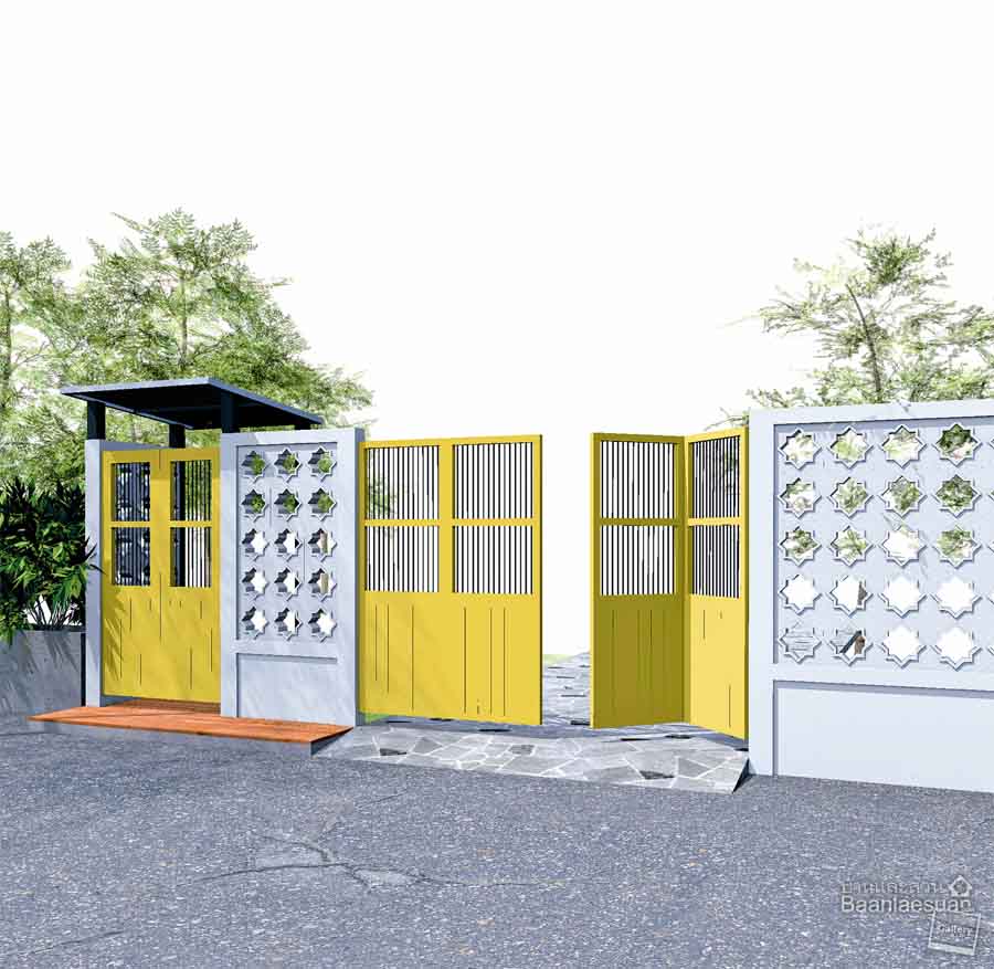 สร้างสรรค์ลวดลายที่สวยงามแปลกตาแบบง่ายๆ ด้วยการใช้บล็อกช่องลมที่มีลวดลายสวยงามเรียงต่อกันและยังสามารถรับลมได้ดี ออกแบบประตูรั้วเป็นบานเฟี้ยมที่เหมาะสำหรับพื้นที่จำกัดที่ไม่สามารถทำรางเลื่อนด้านข้างได้ แล้วยังไม่เสียพื้นที่ในการเปิดมากเท่ากับบานเปิดคู่ พร้อมทำซุ้มทางเดินเข้ามีหลังคาคลุมซึ่งอาจทำต่อเนื่องไปถึงตัวบ้านให้เดินเข้าบ้านโดยไม่เปียกฝนก็ได้