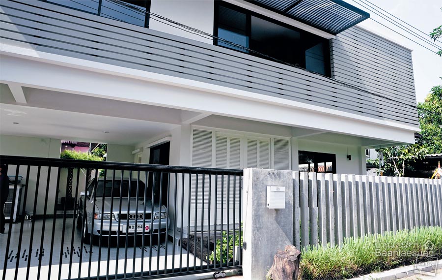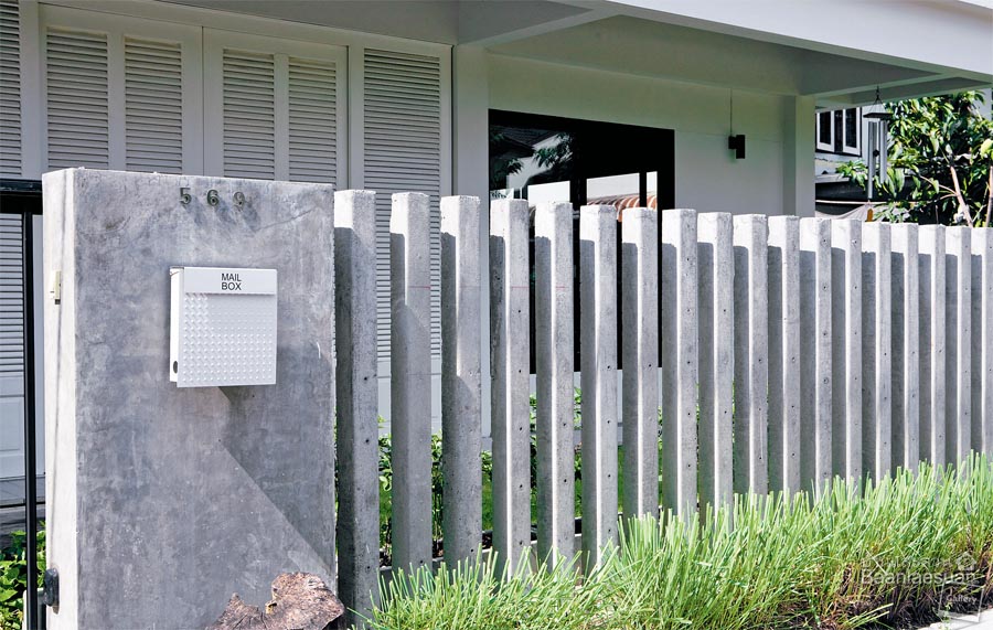 ออกแบบรั้วให้เข้ากับบ้านเรียบเท่แบบโมเดิร์น โดยใช้เสาคอนกรีตสำเร็จรูปตั้งเรียงเป็นแนวแบบรั้วโปร่ง แล้วออกแบบประตูบานเลื่อนเหล็กโดยเน้นการใช้เส้นแนวตั้งและแนวนอนให้ล้อไปกับเส้นสายของตัวบ้านให้อารมณ์ดิบ เท่ และยังแข็งแรงทนทานอีกด้วย