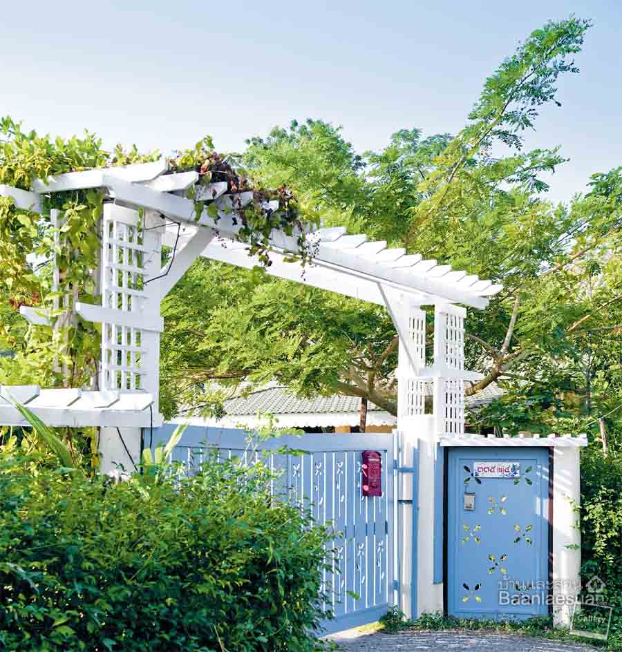 เอาใจคนรักสวนด้วยแบบรั้วและซุ้มประตูแสนหวานที่เข้ากับธรรมชาติเป็นอย่างดี ออกแบบเป็นซุ้มไม้เลื้อยสีขาวทั้งประตูทางเข้าและตลอดแนวความยาวรั้ว แล้วฉลุลายดอกไม้ทาสีฟ้าพาสเทล ให้ความรู้สึกอบอุ่นและเป็นกันเอง