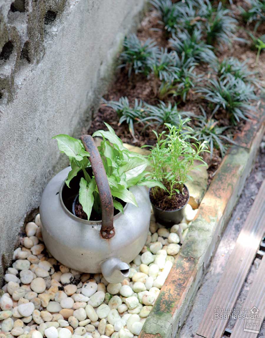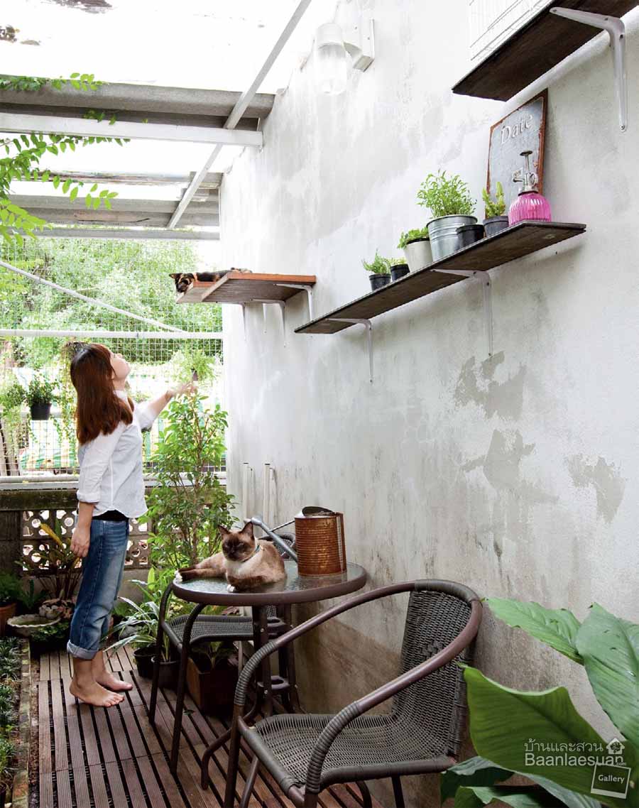 เปลี่ยนมุมแคบๆของบ้านให้เป็นมุมสวนขนาดเล็กพื้นที่สีเขียวด้วยการโรยดินและปลูกต้นไม้เล็กๆไว้ที่พื้น จากนั้นนำไม้ระแนงมาวางเพื่อสร้างเป็นแนวทางเดิน เพิ่มลูกเล่นด้วยชุดโต๊ะนั่งกลางแจ้งที่ทำจากวัสดุธรรมชาติ ก็ช่วยสร้างเสริมบรรยากาศให้ดูผ่อนคลายได้เป็นอย่างดี
