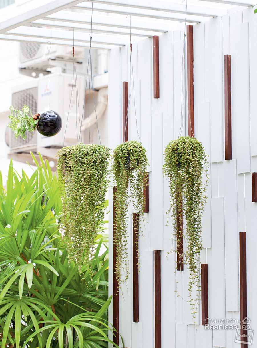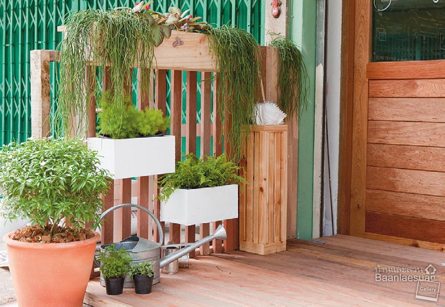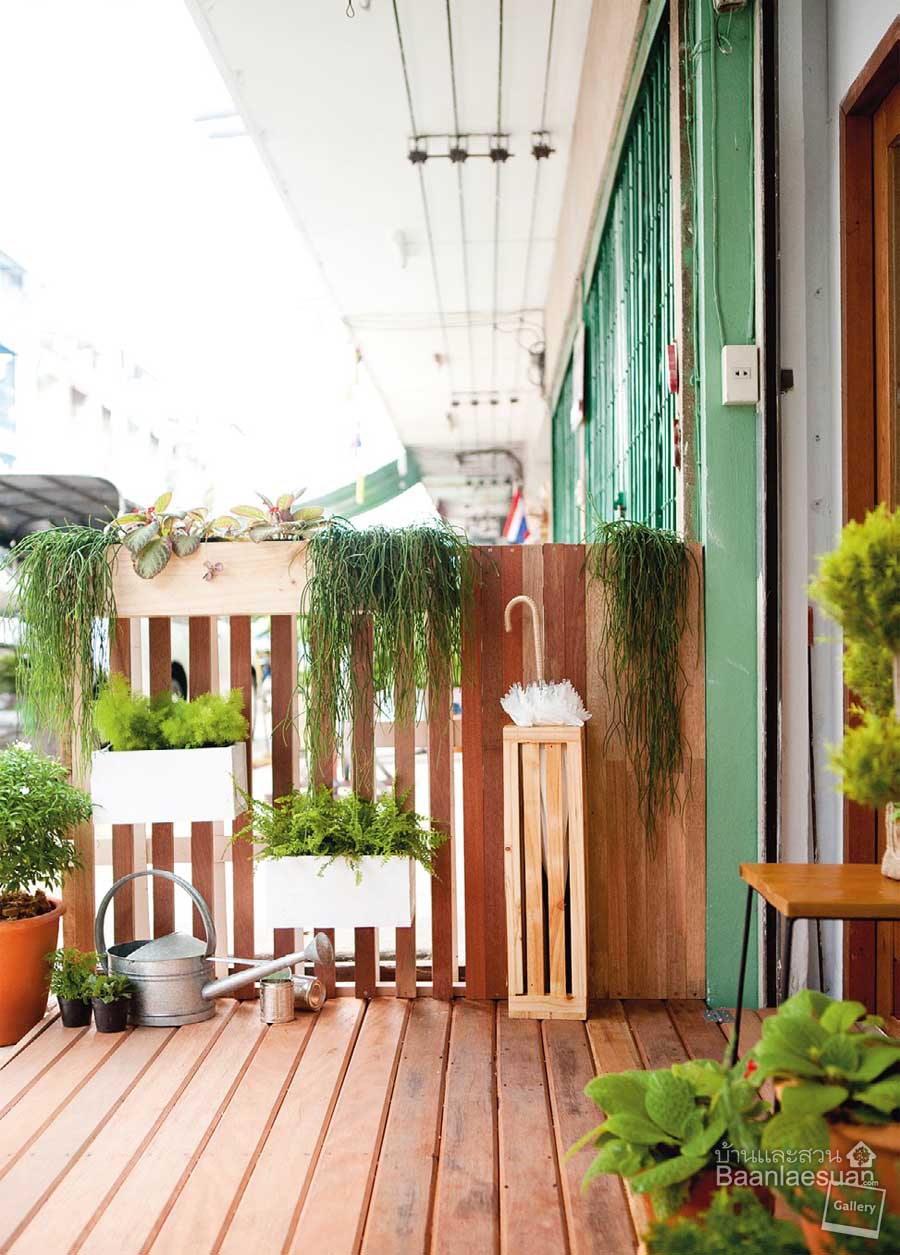 ก็สามารถมีสวนขนาดเล็ก สวนหน้าบ้านได้ ด้วยการต่อระแนงไม้เพิ่มออกมา จัดสรรพื้นที่เพิ่มด้วยการนำกระถางแขวนมาปลูกพรรณไม้เล็กๆน้อยๆเพื่อเพิ่มสีเขียว