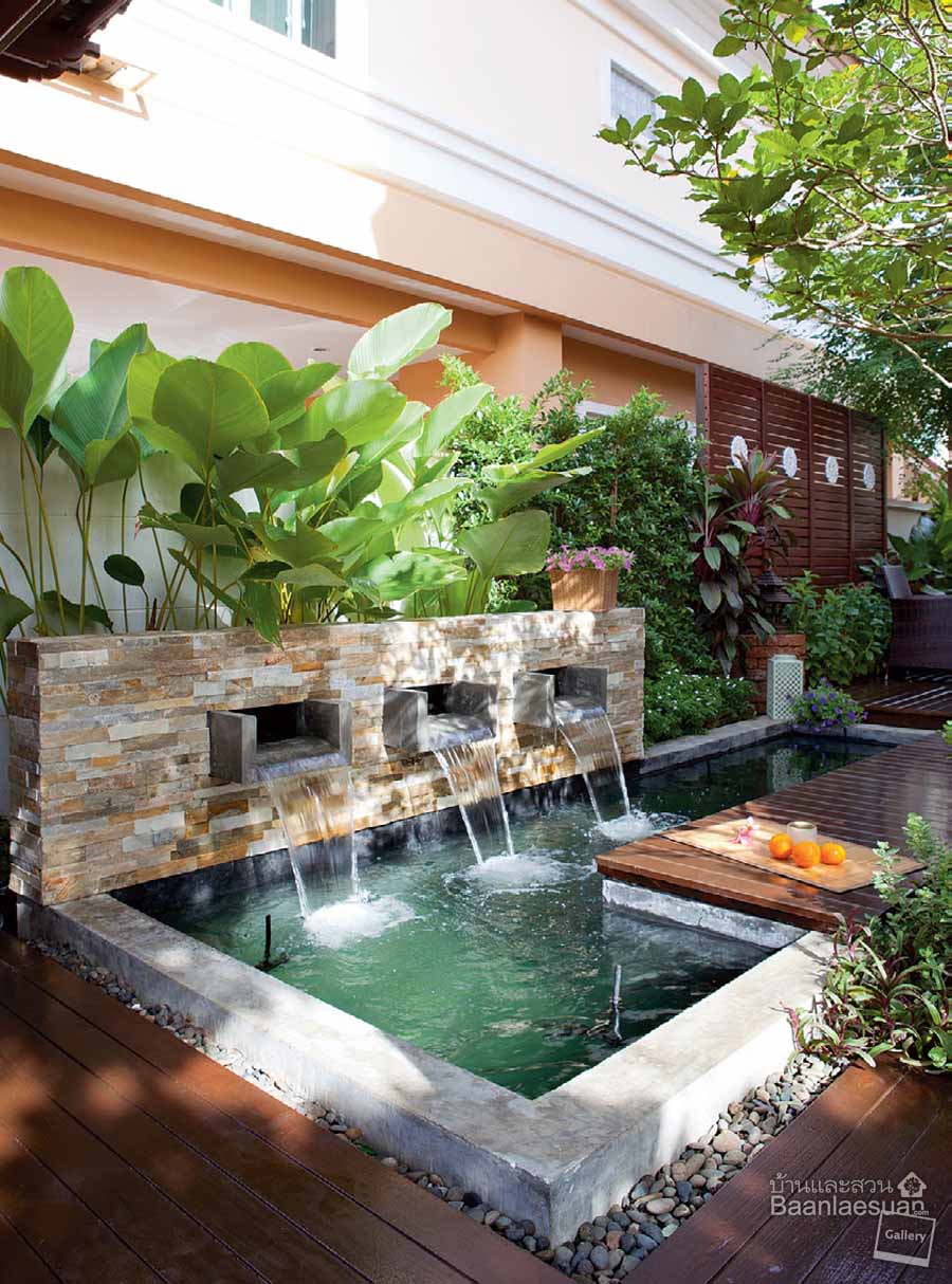 น้ำตกจำลอง สวนขนาดเล็ก สวนข้างบ้าน ไอเดียจัดสวน