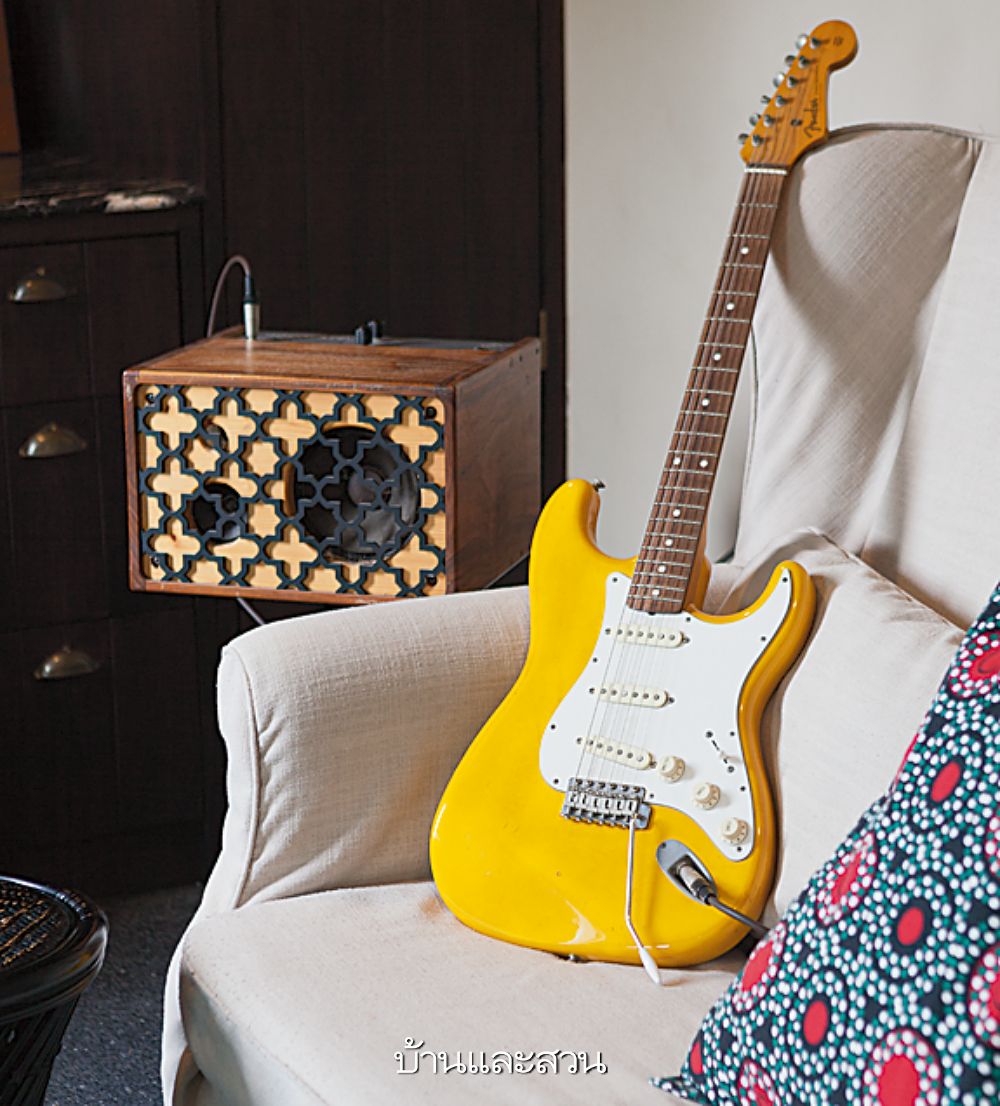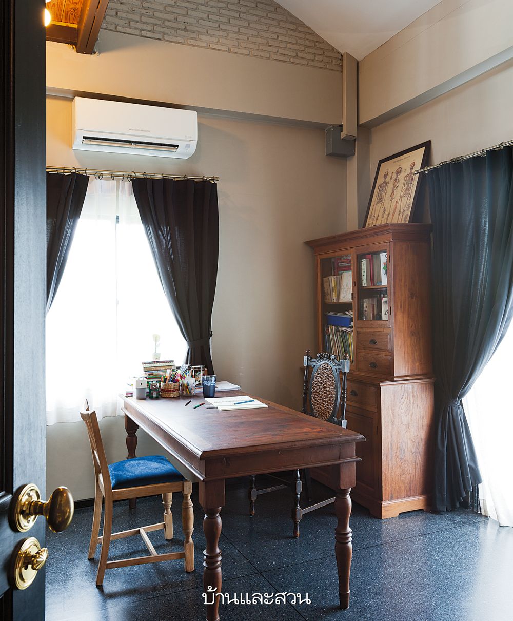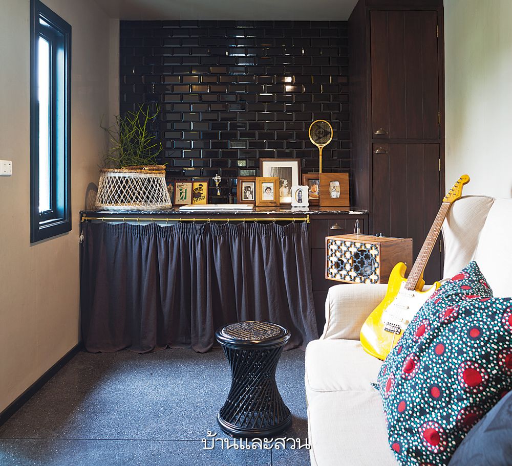 “ส่วนตัวชอบงานศิลปะและงานฝีมือในแถบศรีลังกาอยู่แล้ว ก่อนทำบ้านหลังนี้เราทั้งคู่มีโอกาสไปทริป Vernacular House ที่ศรีลังกากับ อาจารย์จิ๋ว – รองศาสตราจารย์วิวัฒน์ เตมียพันธ์ ไปชมสถาปัตยกรรมงานฝีมือท้องถิ่น วัฒนธรรม และวิถีชีวิต เรามีโอกาสได้ชมบ้านของเจฟฟรีย์ บาวา สถาปนิกชื่อดังที่ชื่นชอบอยู่แล้ว ยิ่งทำให้ได้เรียนรู้แนวคิดในเรื่องการจัดวางพื้นที่ การดึงเอกลักษณ์และรายละเอียดของงานมาจากวัฒนธรรม วิถีชีวิต และความเป็นพื้นถิ่นมาปรับใช้ในงานออกแบบ สิ่งเหล่านี้ทำให้การอยู่อาศัยมีความน่าอยู่อยู่แล้วสบาย มีมนตร์เสน่ห์ เราสามารถอยู่ได้ตลอดชีวิต”
