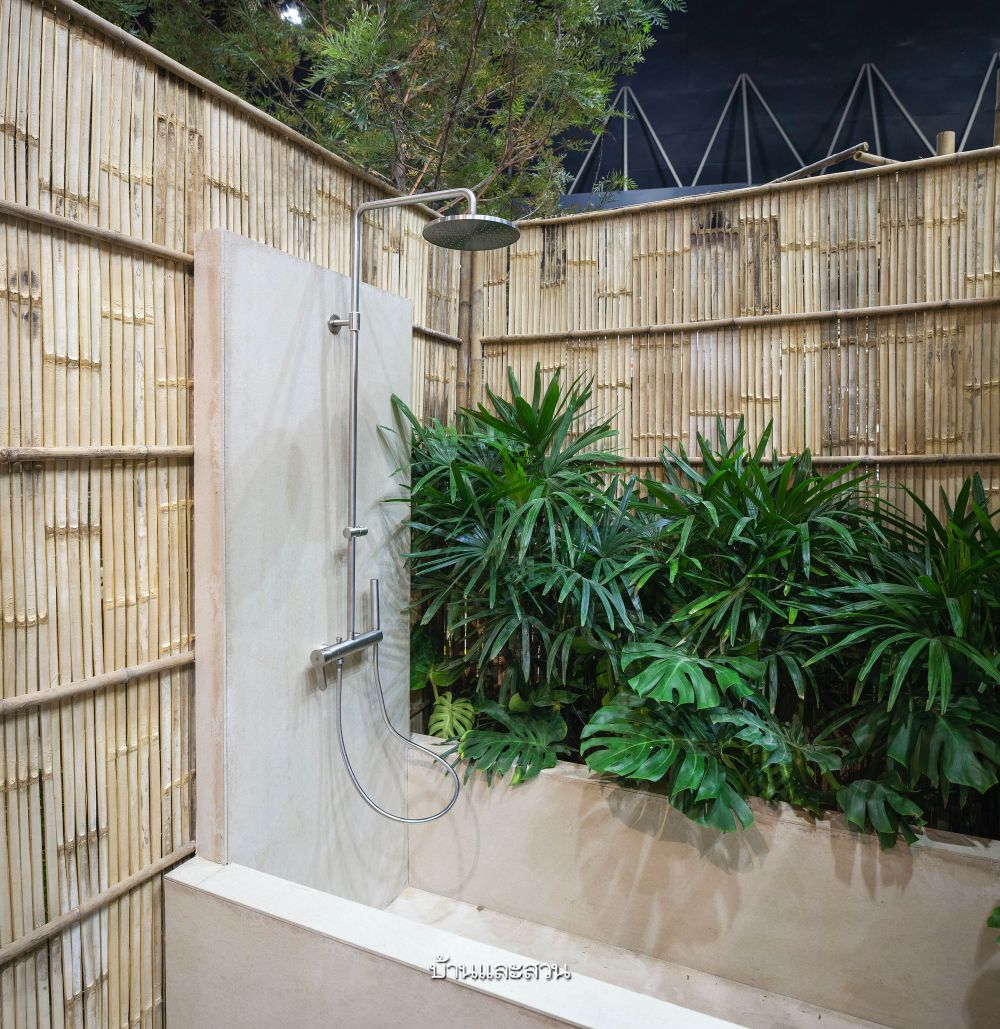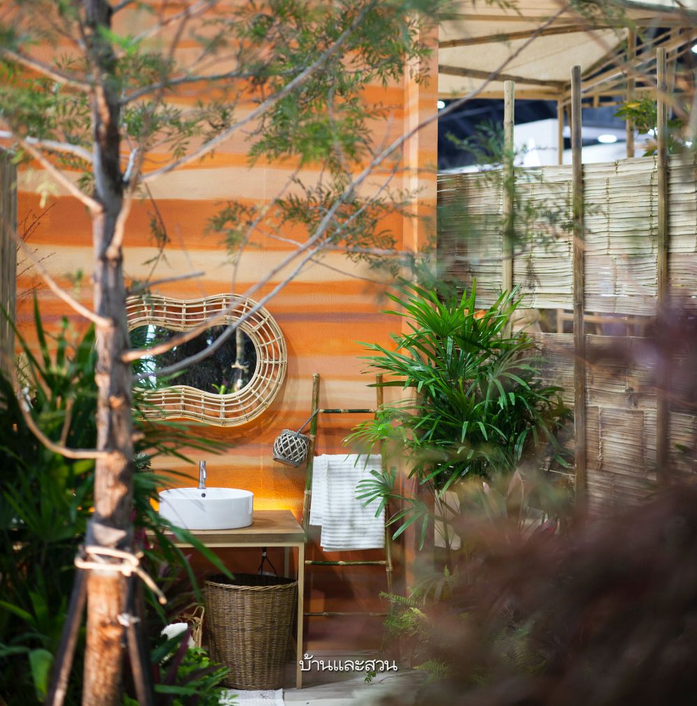 การออกแบบห้องน้ำให้เหมือนกับการอาบป่าใกล้ชิดธรรมชาติ ทำทางเดินลดระดับลัดเลาะตามแนวต้นไม้ เสมือนเส้นทางเดินธรรมชาติที่พาไปสู่สเปซส่วนตัว อาบน้ำอย่างผ่อนคลายด้วยเรนชาวเวอร์ และชุดสุขภัณฑ์จาก VRH เลือกใช้กระจกเงาหวายสานเป็นรูปทรงฟรีฟอร์มจาก Brezza Dee