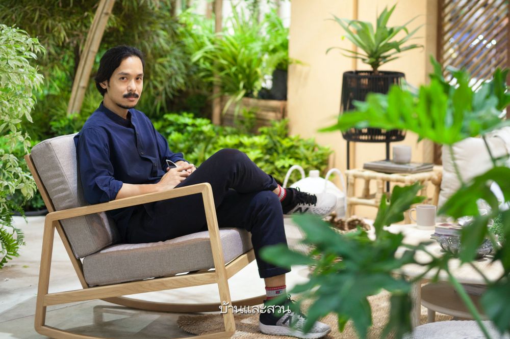 มุมระเบียงตกแต่งด้วยเก้าอี้และโคมไฟตั้งพื้นจาก Podium โต๊ะกลางจาก niiq สตูลทรงกลมจาก Filobula