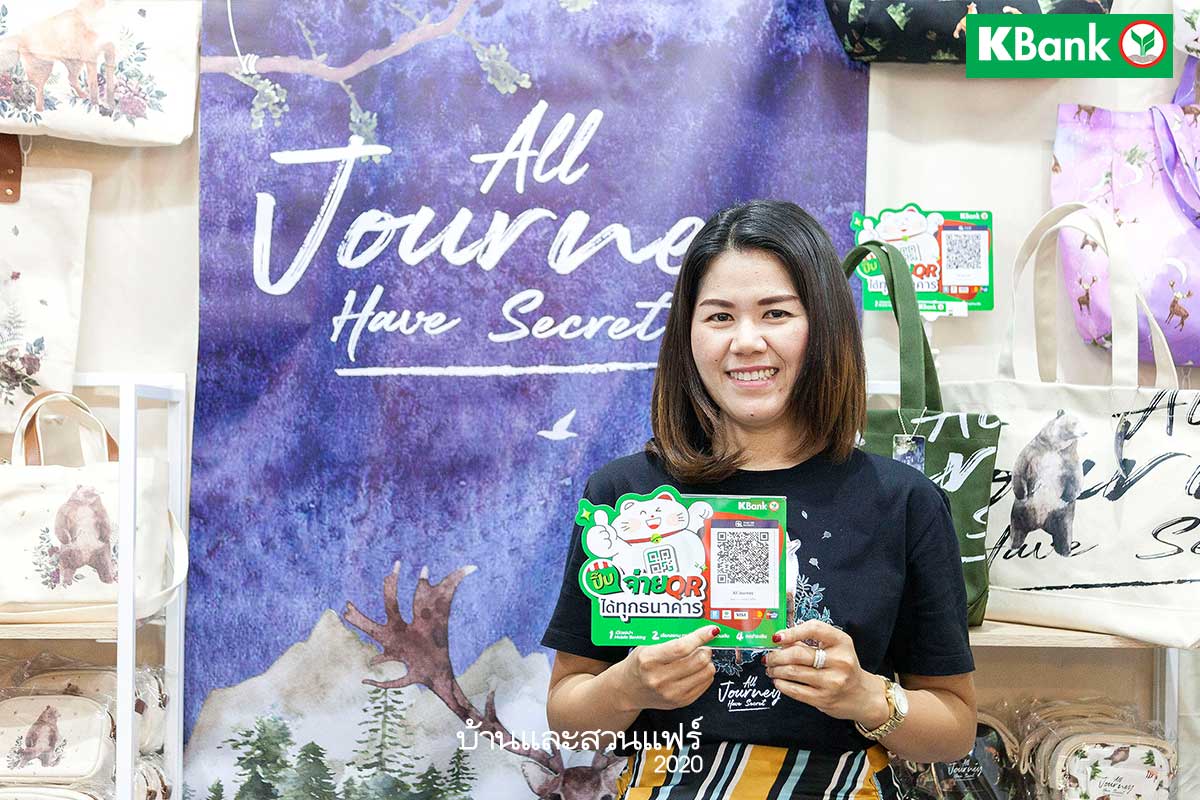 แต่ไม่ใช่เฉพาะร้านประจำที่มางานบ้านและสวนแฟร์เท่านั้น ร้านค้าน้องใหม่อย่าง All Journey ร้านจำหน่ายสินค้าพิมพ์ลายเฟล็กทั้งกระเป๋า หน้ากาก เสื้อ ผ้าคลุมไหล่ ที่มีความน่ารักซ่อนอยู่ในดีไซน์เรียบหรู ก็เลือกใช้ K PLUS shop ด้วยเช่นกัน ซึ่งคุณนุช กรรณิกา สุขโหตุ เจ้าของร้านที่รับหน้าที่เป็นดีไซเนอร์ ออกแบบเอง ขายเอง และยังต้องจัดการบัญชีในแต่ละวันเองด้วย การเลือกใช้ K PLUS shop นั้นเป็นตัวช่วยชั้นดีที่แบ่งเบาความยุ่งยากในการเช็คยอดขายสินค้าของแม่ค้ามือใหม่ได้เป็นอย่างดี