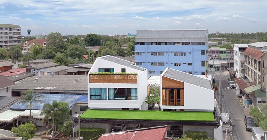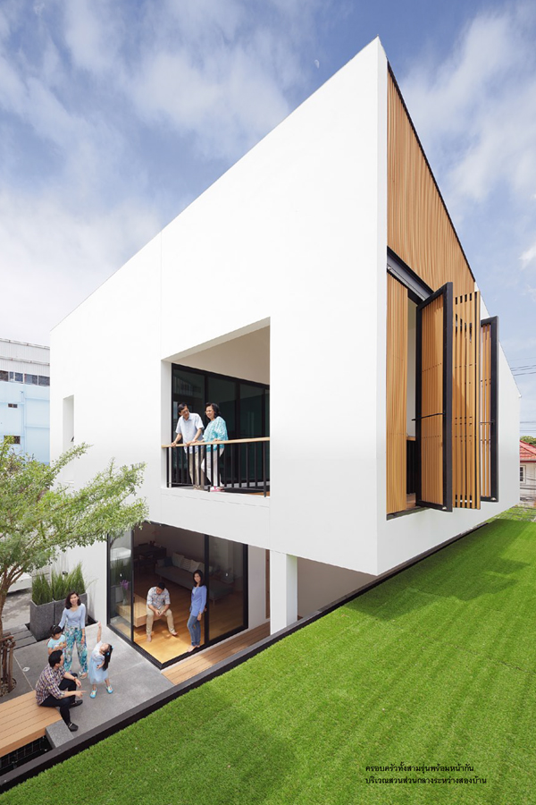 “บ้านสวย” จะพาคุณผู้อ่านไปพบกับบ้านแฝดที่น่าสนใจ เพราะเจ้าของก็เป็นฝาแฝดด้วยเช่นกัน บ้านสองหลังของสองครอบครัว คุณปิ๊ก ชุติมา บุญนำกิจสวัสดิ์ และคุณปี้น ชุติมน ศิริวิทยรัตน์ ซึ่งเลือกสร้างบ้านอยู่ในบริเวณเดียวกัน แม้ว่าต่างก็มีครอบครัวของตัวเองแล้วก็ตาม อันที่จริง…หากพูดให้ถูกคือเป็นบ้านสองหลังที่เชื่อมติดกัน ในความเหมือนที่ต่างกันนั้นยังมีรายละเอียดของพื้นที่ระหว่างกลาง (In Between Space) ทั้งพื้นที่ในเชิงกายภาพ (Physical) และพื้นที่ในเชิงความรู้สึก (Spiritual) พื้นที่ส่วนตัวและการประนีประนอมให้เกิดพื้นที่แห่งการมีส่วนร่วม (Share Space) ส่วนผสมที่ลงตัวเหล่านี้จะเป็นอย่างไร เราค่อยๆเข้าไปชมพร้อมๆกันเลยดีกว่าครับ