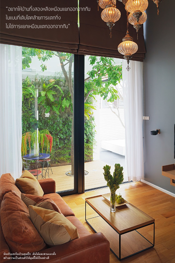 ในความเหมือนยังมีความแตกต่าง สิ่งที่เราค้นพบเมื่อคุณปิ๊กและคุณปี้นพาเข้าไปเยี่ยมชมภายในบ้านทั้งสองหลังคือ แม้ว่าจะออกแบบให้มีลักษณะทางสถาปัตยกรรมที่แทบจะเหมือนกัน แต่ด้วยรายละเอียดที่ตีความขึ้นจากการใช้ชีวิตของทั้งสองครอบครัว เราค้นพบว่าบ้านของคุณปิ๊กจะมีความเป็นส่วนตัวผ่านการใช้พื้นที่ในแนวตั้ง สิ่งที่น่าสนใจคือแม้จะนั่งมองสวนอยู่ในห้องรับแขก บ้านหลังนี้ก็ยังสร้างความผ่อนคลาย ไม่รู้สึกถูกรบกวน ในขณะที่บ้านของคุณปี้นจะมีการเปิดโล่งในลักษณะการแผ่ขยายทางแนวราบคล้ายกับบ้านไทยสมัยก่อน จากห้องรับแขกสามารถเชื่อมกับชานบ้านที่เชื่อมต่อไปยังชานรวมของสวนส่วนกลางได้อีกด้วย หรือแม้แต่ห้องนอนก็ผนวกเข้ากับระเบียง ซึ่งเป็นอีกพื้นที่โปรดของครอบครัว