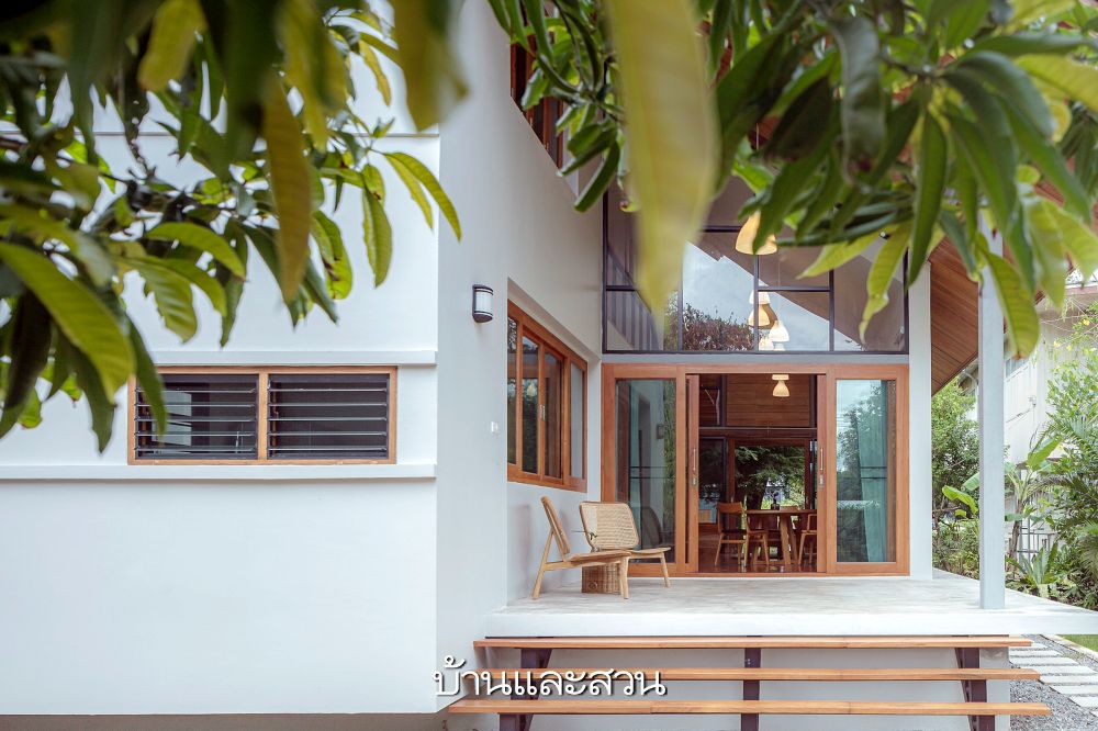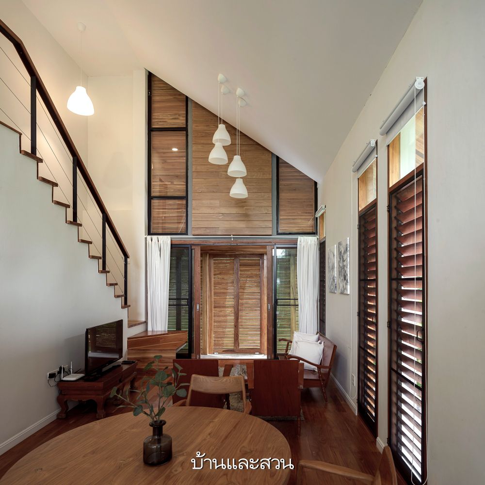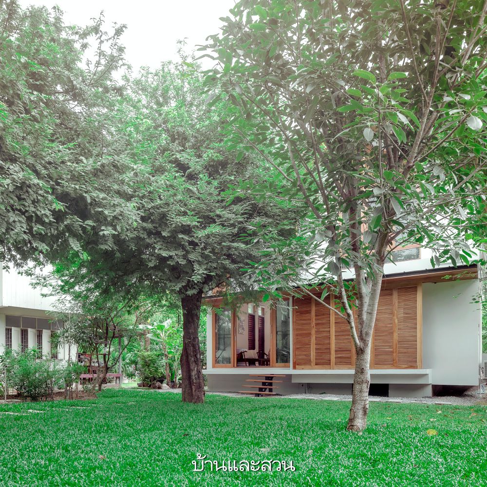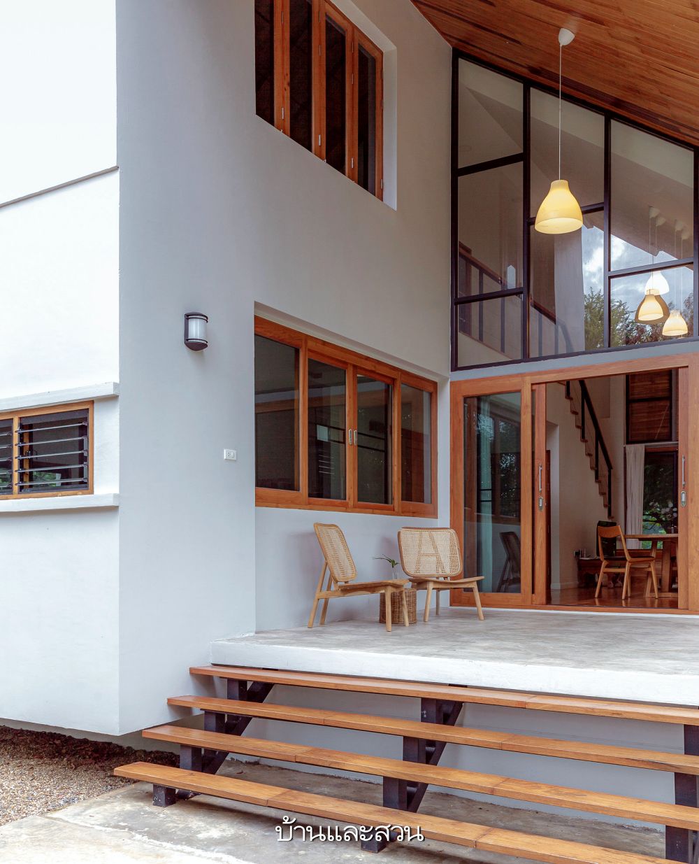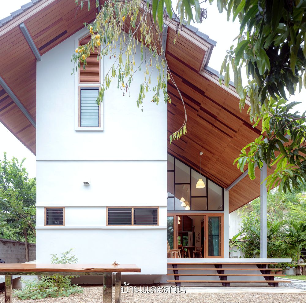 หลังจากทำการสำรวจบริบทประกอบกับความต้องการ ผลลัพธ์ที่ได้จึงออกมาเป็น “บ้านหน้าจั่ว” ที่ให้ความรู้สึกโฮมมี่ เป็นกันเอง แต่ยังเจือกลิ่นอายของความทันสมัยด้วยความไม่สมมารตรของหลังคา ทั้งยังคงเอกลักษณ์ความเป็นบ้านต่างจังหวัดไว้ด้วย “ชาน” เพื่อสะท้อนรูปแบบความสุขของการได้ออกมาใช้ชีวิตนอกบ้านท่ามกลางอากาศบริสุทธิ์และแมกไม้เขียวชอุ่มของบริเวณโดยรอบบ้านเดิมไว้อย่างเด่นชัด![]()