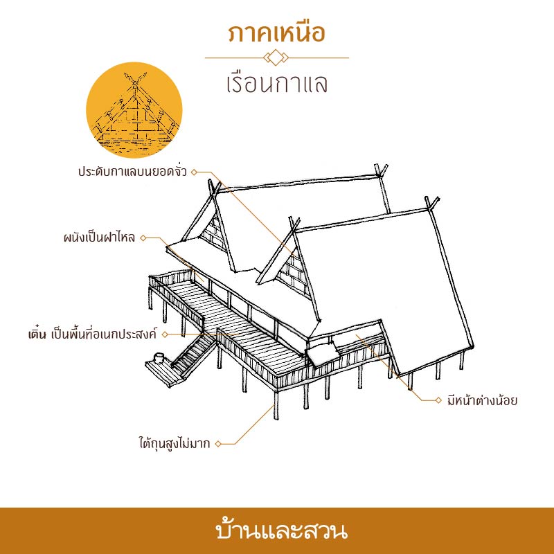 บางส่วนของภาคเหนือเดิมเป็นส่วนหนึ่งของอาณาจักรล้านนา จึงมีรูปแบบสถาปัตยกรรมเฉพาะ แตกต่างจากภาคอื่น สถาปัตยกรรมที่โดดเด่นที่สุดคือ “เรือนกาแล” เป็นเรือนสำหรับผู้มีฐานะ หรือผู้นำชุมชน แตกต่างจากเรือนสามัญชนตรงที่จะก่อสร้างด้วยความประณีต มีแบบแผนการสร้างเป็นระเบียบชัดเจน และมีการประดับ “กาแล” ซึ่งเป็นไม้แกะสลักสวยงามบนยอดจั่ว เรือนกาแลเป็นเรือนไม้เนื้อแข็ง ยกใต้ถุนสูงไม่มาก มักเป็นเรือนแฝด นิยมสร้างหลังหนึ่งใหญ่กว่าอีกหลังตามความเชื่อ มีหลังคาใหญ่ ชายคาคลุมเรือนเกือบทั้งหมด มีหน้าต่างน้อย ผนังผายออก มักมี “ฝาไหล” เป็นฝาไม้กระดานที่เลื่อนเปิด – ปิดได้เพื่อช่วยรับลมเข้าบ้าน และมีครัวไฟแยกออกไปเป็นสัดส่วน มี “เติ๋น” เป็นพื้นที่กึ่งเปิดโล่งอเนกประสงค์สำหรับใช้นั่งเล่น ซึ่งมีตำเเหน่งอยู่ระหว่างห้องกับ “นอกชาน” ที่เป็นพื้นที่เปิดโล่ง