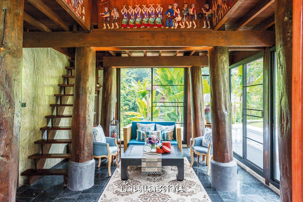 บ้านรับรองแขกที่ดัดแปลงจากเรือนยุ้งข้าวเก่า โดยอิงงานสถาปัตยกรรมแบบล้านนา แต่ปรับขนาดให้สามารถอยู่อาศัยได้อย่างสะดวกสบาย ในส่วนของงานตกแต่งก็ใช้วัสดุที่หาได้ในท้องถิ่น เพิ่มความสวยงามด้วยรายละเอียดของงานไม้แกะ เฟอร์นิเจอร์สไตล์ไทยแบบขาสิงห์และขาคู้ เก้าอี้หวาย หรืองานเซรามิกโทนสีบลูแอนด์ไวท์ นอกจากนี้ยังใช้วัสดุธรรมชาติอย่างหินอ่อนและหินธรรมชาติ ซึ่งเก็บความเย็นได้ดี เมื่อรวมกับการออกแบบบ้านให้เปิดโล่งกลมกลืนไปกับธรรมชาติ ก็ช่วยสร้างบรรยากาศที่ทั้งน่าอยู่และเย็นสบายได้ไม่ยาก อ่านต่อ