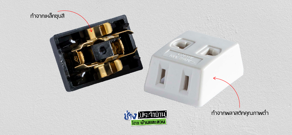 ขาเต้ารับซึ่งเป็นส่วนหนึ่งของวงจรภายในหัวปลั๊ก ควรทำจากทองเหลืองหรือทองแดง เพราะนำไฟฟ้าได้ดีกว่าเหล็กชุบสีหรือโลหะอื่นๆ ไม่ทำให้เกิดความร้อนสะสม จึงช่วยลดปัญหาปลั๊กละลายหรือไหม้ ซึ่งเป็นสาเหตุทำให้เกิดไฟฟ้าลัดวงจร ส่วนบ้านที่มีเด็กเล็ก อาจใช้รุ่นที่มีม่านนิรภัย (Safety Shutter) เพื่อป้องกันเด็กเอานิ้วมือแหย่รู