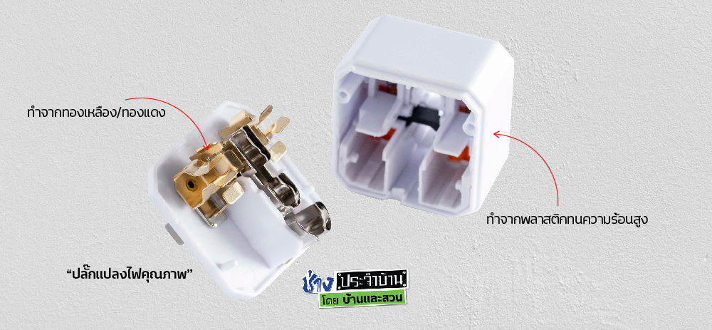 วัสดุที่ใช้ทำปลั๊กแปลงขา ควรทำจากวัสดุคุณภาพสูง มีคุณสมบัติไม่ลามไฟ เช่น พลาสติก ABS หรือพอลิคาร์บอเนต (PC) ซึ่งทนความร้อนและแรงกระแทกได้ดีกว่าพลาสติก PVC ช่วยลดความเสี่ยงการเกิดเพลิงไหม้ กรณีเกิดความร้อนสูง ขณะใช้งานต่อเนื่องเป็นเวลานาน เช่น ใช้กับหม้อทอดไร้น้ำมัน หรือหม้ออบลมร้อนที่กินไฟมาก