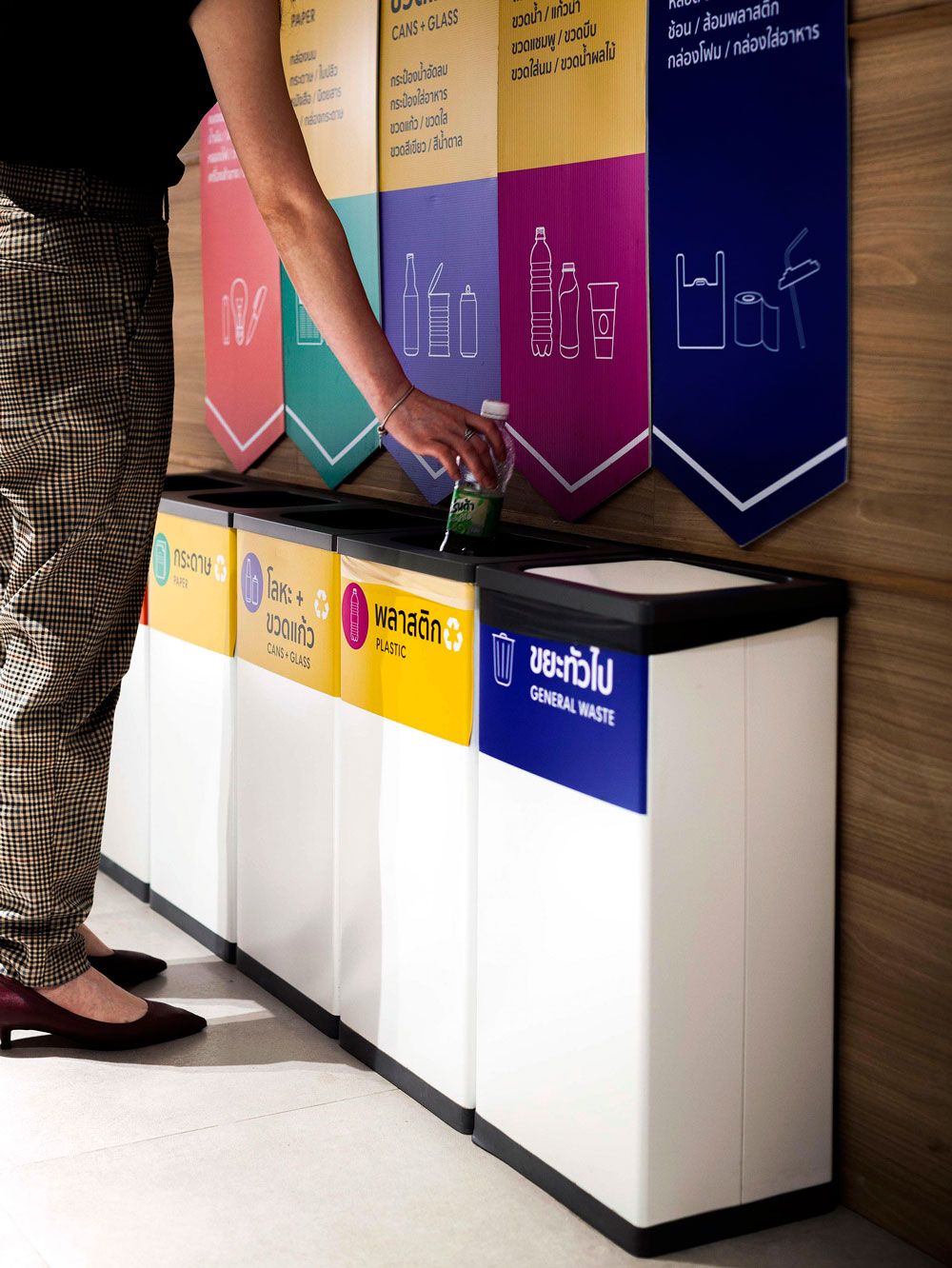 ขึ้นชื่อว่าเป็นการเปลี่ยนแปลง แม้จะมาจากสิ่งเล็ก ๆ เพียงสิ่งเดียว ก็สามารถมีผลออกไปได้เป็นวงกว้าง แม้จะต้องใช้เวลาเป็นตัวช่วยในการปรับเปลี่ยนพฤติกรรมเดิม ๆ ให้กลายเป็นเรื่องปกติใหม่ ๆ ได้อย่างมีประสิทธิภาพ บริษัท เซ็นทรัลพัฒนา จำกัด (มหาชน) ตั้งใจจะปรับเปลี่ยนพฤติกรรมของพนักงาน ไปพร้อม ๆ กับการรีโนเวทออฟฟิศ ด้วยถังขยะเพียงใบเดียว “ เราตั้งใจไม่ให้พนักงานมีถังขยะไว้ที่โต๊ะตัวเอง เพราะเศษอาหารเพียงเล็กน้อยที่ร่วงอยู่ที่พื้นนั้นสามารถเป็นอาหารของแมลงได้ เลยใช้ช่วงที่รีโนเวทออฟฟิศปรับเปลี่ยนพื้นที่วางถังขยะ มาไว้ที่บริเวณทางเดินส่วนกลางเพียงจุดเดียว ทำให้เกิดความไม่สะดวกในการทิ้งขยะง่าย ๆ เหมือนเมื่อก่อน คล้ายกับการสร้างช่วงเวลาตัดสินใจ ให้พนักงานได้คิดก่อนจะทิ้ง ถ้าสร้างขยะเยอะ เท่ากับต้องลุกไปทิ้งบ่อย ช่วงเวลาตรงนี้ทำให้ยับยั้งชั่งใจ ก่อนจะทิ้งอะไรขยะชิ้นนั้นได้ถูกใช้งานอย่างคุ้มค่าแล้วหรือยัง กับบางอย่างอำนวยความสะดวกดี มันก็ดีไป แต่กับบางอย่างพอมีเยอะเกินไป กลายเป็นส่งเสริมพฤติกรรมหรือเปล่า เรื่องการแยกขยะที่เป็นนโยบายของบริษัท มันต้อค่อยเป็นค่อยไป พอติดป้ายบอกประเภทบวกกับใช้ฝาถังให้สอดคล้อง พนักงานก็แยกขยะกันเองได้ดีขึ้น ส่งผลต่อกระบวนการกำจัดขยะก็มีประสิทธิภาพมากตามไปด้วย ”