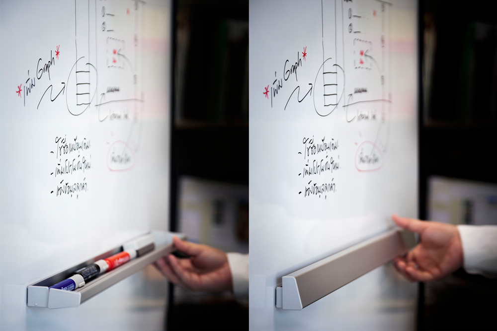 เสน่ห์ของโครงสร้างและการเลือกใช้สีที่ดูเรียบง่าย แฝงไปด้วยเสน่ห์เหลือล้นของเฟอร์นิเจอร์สัญชาติญี่ปุ่น ที่ใช้เส้นโค้งเป็นองค์ประกอบหลัก จึงทำให้เข้ากับสไตล์การตกแต่งออฟฟิศสำนักงานได้อย่างหลากหลาย ช่วยปรับสภาพแวดล้อมภายในออฟฟิศให้ดีขึ้น น้ำหนักเบา เคลื่อนย้ายได้ง่ายไม่ต้องออกแรงเยอะ แข็งแรง ทนทาน เป็นมิตรกับผู้ใช้งานด้วยมาตรฐานจากญี่ปุ่น แก้ไขปัญหาความไม่เป็นระเบียบบริเวณถาดวางปากกาไวท์บอร์ด ด้วยการออกแบบถาดให้สามารถเปิดปิดได้ ทำหน้าที่ทั้งการจัดระเบียบ และการหยิบใช้งานได้อย่างมีประสิทธิภาพ