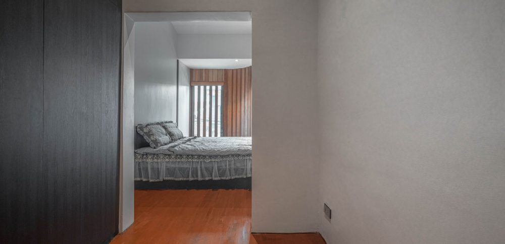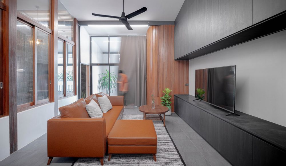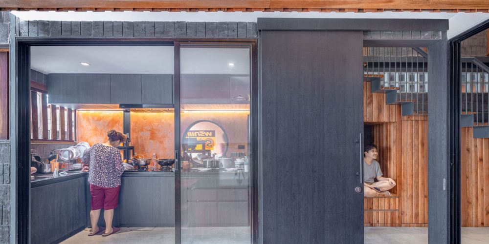 อีกหนึ่งข้อจำกัดคือบริบทโดยรอบของบ้านถูกปิดล้อมมุมมอง และส่งผลถึงระบบการระบายอากาศที่ดี ผู้ออกแบบจึงใช้วิธีการทะลายความคุ้นชินเดิม ๆ ของการสร้างบ้านที่มักออกแบบพื้นที่หน้าบ้านเป็นมุมรับแขก แล้วผลักตำแหน่งครัวในผังไปไว้หลังบ้านเหมือนปกติทั่วไป