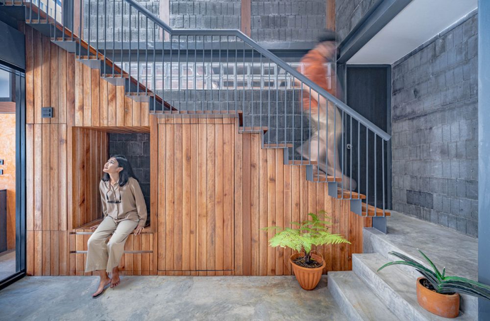 จากพื้นที่ครัวไทย และส่วนรับประทานอาหาร ถัดเข้ามาสู่พื้นที่ภายในบ้าน โถงบันไดของอาคารถูกนำมาใช้แบ่งพื้นที่ระหว่างฝั่งที่พักอาศัยและฝั่งโรงงานพริกแกง พื้นที่ส่วนนี้ได้รับการออกแบบให้เป็นโถงอาคารแบบโอเพ่นสเปซขึ้นไปถึงชั้นสอง ส่วนพื้นที่ด้านล่างบันไดยังได้รับการดัดแปลงให้เป็นพื้นที่นั่งเล่นและใช้เก็บของได้อีกทางหนึ่ง