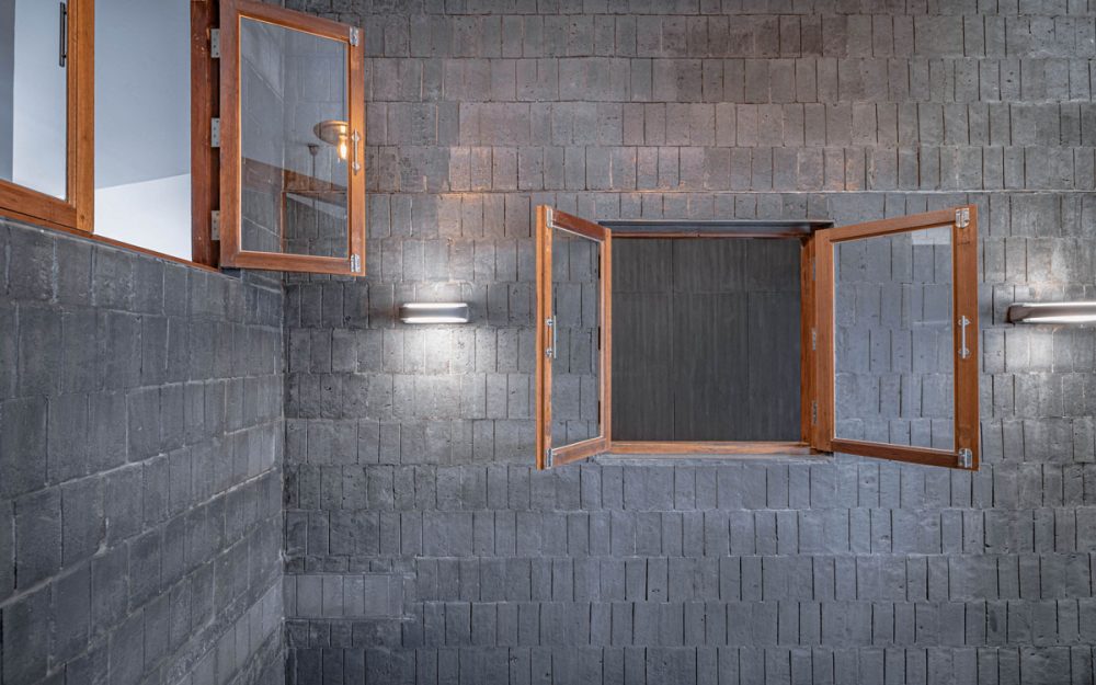 ในขณะเดียวกัน ส่วนเหนือโถงบันไดออกแบบให้มีช่องหน้าต่างของห้องนอน 2 ห้อง รวมถึงห้องนั่งเล่นที่เชื่อมต่อมุมมองภายในบ้านเข้าด้วยกัน พร้อมเปิดช่องแสงตรงส่วนหลังคา เพื่อให้แสงธรรมชาติสามารถลอดผ่านลงมาสู่ใจกลางตัวอาคารได้ทั่วถึง ซึ่งช่วยให้ภายในบ้านได้รับแสงสว่างที่เพียงพอและช่วยประหยัดพลังงานจากการเปิดไฟในเวลากลางวันไปโดยปริยาย