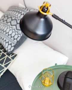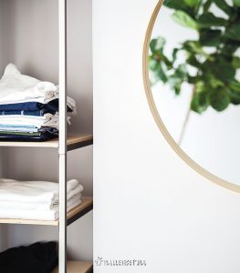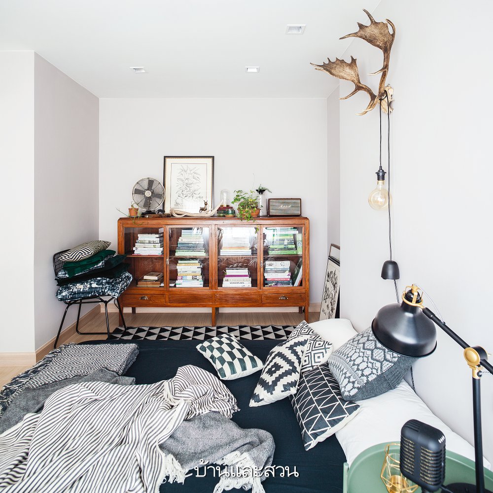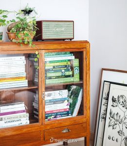 ห้องนี้เดิมทีออกแบบไว้รองรับเฟอร์นิเจอร์บิลท์อิน แต่เพราะคุณวิทย์ชอบเฟอร์นิเจอร์ลอยตัวมากกว่า จึงทำให้เหลือพื้นที่ซอกหลืบอยู่หลายจุด ดังนั้นการเลือกขนาดเฟอร์นิเจอร์จึงสำคัญมาก ส่วนใหญ่คุณวิทย์จะเลือกใช้ตู้ไม้ขนาดกลาง เพื่อให้เหลือพื้นที่ด้านบนมากขึ้น ทำให้ห้องขนาดเล็กดูไม่อึดอัด พร้อมกับปรับเปลี่ยนฟังก์ชันใช้สอยเดิมของโครงการ เพราะไม่เข้ากับการใช้งาน เช่น เปลี่ยนส่วนวอล์คอินคลอเซตเป็นมุมตู้หนังสือ ปรับมุมแต่งตัวเล็กๆ ข้างหน้าต่างเป็นมุมนั่งเล่นและวางต้นไม้แทน