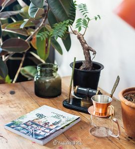 สำหรับการตกแต่งภายในก็เหมือนเป็นการย่อส่วน Little Tree มาไว้ที่นี่ คุณวิทย์นำของสะสมที่ซื้อเก็บไว้มาจัดวางใหม่ มีซื้อเพิ่มบ้างเพื่อให้เข้ากับพื้นที่ “ตอนแรกตั้งใจจะทำอะไรหลายอย่าง แต่ด้วยข้อจำกัดของคอนโด จึงทำอะไรมากไม่ได้ ก็เลยใช้วิธีเลือกสิ่งที่เป็นเรา ทั้งสไตล์ รูปแบบการจัดวาง และสีสันต่างๆ ตอนนี้ชอบผนังสีดำ แต่ที่บ้านก็ทาไปแล้ว ที่นี่จึงปรับเป็นสีเขียวเข้ม จากผ้าม่านและต้นไม้ต่างๆ โดยแทรกสีดำจากของตกแต่งแทน ด้วยข้อจำกัดของพื้นที่ถ้าใช้สีดำมากไปห้องก็ดูแคบอีก จึงต้องใช้สีอ่อนมาช่วย อย่าง สีขาวหรือสีเทา วัสดุก็เป็นไม้ดิบๆ ไม่เนี้ยบ ไม่หรูหรา แต่มีของตกแต่งพวกงานโลหะสีทองเหลืองและทองแดงมาช่วย ให้ห้องดูสว่างและเท่ขึ้น” นิยามความสุขของแต่ละคนนั้นแตกต่างกัน หากถามคุณวิทย์ แน่นอนว่า คำตอบก็คือต้นไม้ การได้อยู่ในพื้นที่สีเขียวที่ตัวเองรักและได้ดูแลกับมือทุกวัน นับเป็นความสุขที่ซื้อหาไม่ได้ และเป็นความสุขทางใจ ที่ไม่ว่าใครก็มาแย่งไปไม่ได้จริงๆ