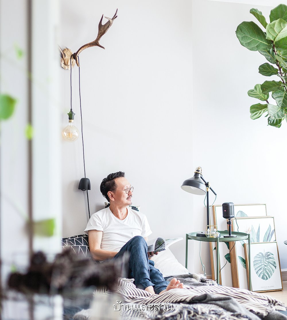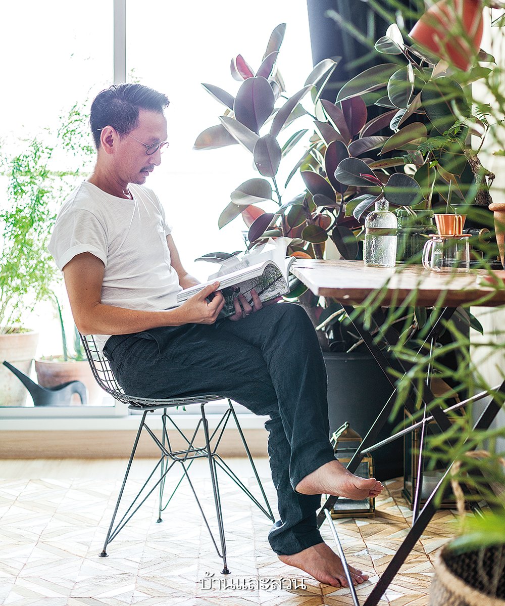 อีกทั้งยังเป็นพื้นที่ทดลองของเราด้วยว่า ถ้าจะนำต้นไม้มาใช้ในคอนโดต้องดูแลอย่างไร ชอบแสงชอบน้ำแค่ไหน แล้วปลูกต้นอะไรได้บ้าง “ที่ซื้อคอนโดไม่ใช่เพราะอยากเป็นคนเมืองอะไรแบบนั้น เราพอใจกับการอยู่บ้าน แต่จุดเริ่มต้นของการทำงานในแต่ละวัน มันเกิดขึ้นแถวๆ นี้ บางวันก็ไปจตุจักรบ้าง รังสิตบ้าง ซึ่งย่านนี้เดินทางไปไหนก็สะดวก ตรงนี้ถือเป็นเซ็นเตอร์ของเรามากกว่าคอนโดใจกลางเมืองที่เข้าไปทีไรก็เจอรถติด”
