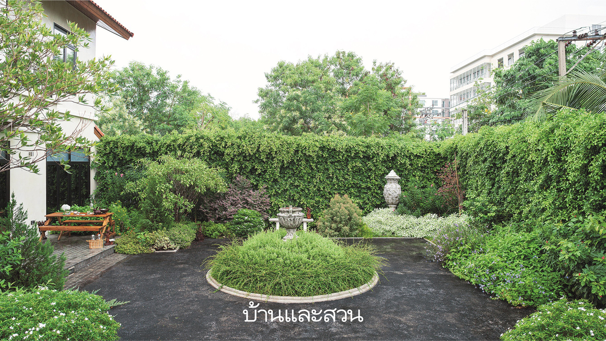 ปูเล่นแพตเทิร์นสี่เหลี่ยมวางต่อกัน พื้นสีเข้มช่วยขับพรรณไม้ให้ดูเด่นสะดุดตายิ่งขึ้น และแยกส่วนพื้นที่บริเวณนี้ให้เป็นมุมนั่งเล่นที่ชัดเจน