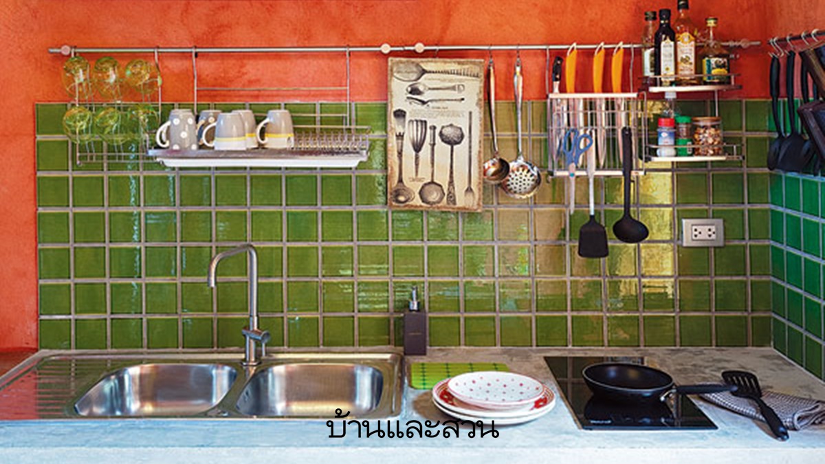 ผนังห้องครัวสีสันสดใส ผนังสีส้มนี้ถูกเติมแต่งด้วยกระเบื้องสีเขียวทำให้ดูมีชีวิตชีวา ด้วยการตัดกันระหว่างสีโทนร้อนและโทนเย็น เพิ่มเติมด้วยลังหวายเป็นที่เก็บของแบบลอยตัว สะดวกต่อการเคลื่อนย้ายได้ตามใจ