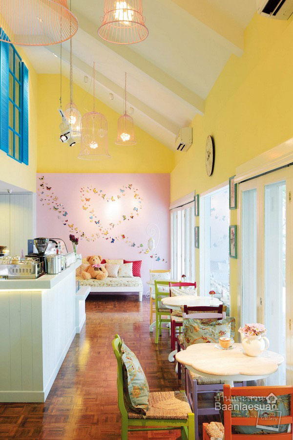 ห้องนี้ใช้โทนสีเหลืองอ่อน และสีชมพูอ่อน ทำให้บรรยากาศดูซอฟท์ ละมุนละไม ประกอบด้วยโคมไฟ มีที่มีกลิ่นอายของความเป็นวินเทจเล็กๆ เติมความหวานให้กับห้องนี้ขึ้นมา ใช้เฟอร์นิเจอร์ไม้ ที่มี สีสัน น่ารัก สดใส