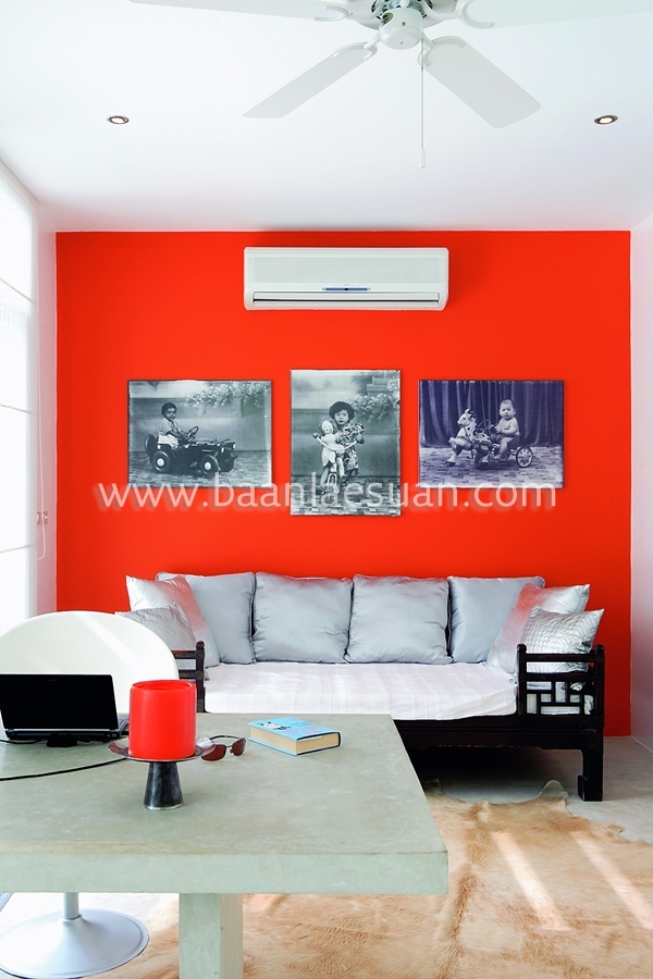 ส่วนห้องนี้เลือกใช้สีแดงสดทาผนังห้อง ทำให้ห้องดูเด่นมาก ควรเลือกใช้เฟอร์นิเจอร์ในลักษณะเดียวกันกับรูปห้องก่อนหน้า คือใช้เฟอร์นิเจอร์สีขาวหรือสีดำ เพื่อตัดกับความเด่นของสีแดง แต่ยังคงความเด่นให้กับสีแดง