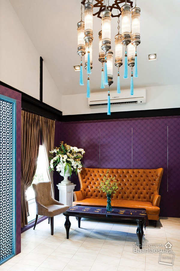 ห้องนั่งเล่นห้องนี้ ถูกตกแต่งด้วยสไตล์ลัคชัวรี่ โดยเลือกใช้วอลเปเปอร์สีม่วงที่เพิ่มลวดลายให้ดูหรูหรา ตัดกับโซฟาหนังดึงกระดุมสไตล์อังกฤษ ลดความสูงของฝ้าเพดานด้วยโคมไฟระย้าสไตล์โมร็อคโค