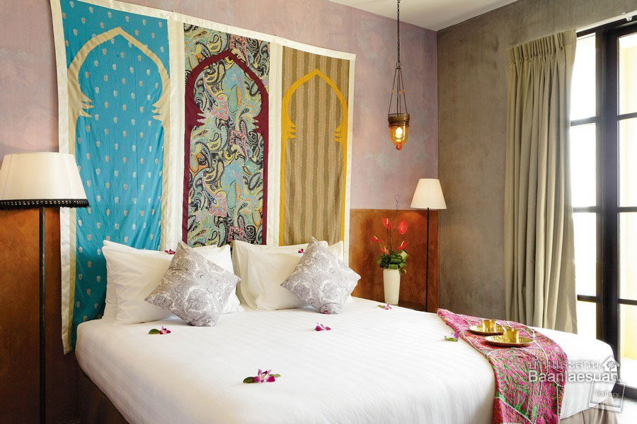 หากบรรยากาศภายในห้องนอนดูเรียบเกินไป เรามีไอเดียการหาของแต่งบ้านในแบบที่สามารถปรับเปลี่ยนได้เรื่อยๆตามความต้องการ ลองหาผ้าลวดลายโบฮีเมี่ยนที่มีสีสันสดใส กับโคมไฟหัวเตียงที่ไม่จำเป็นต้องเป็นโคมไฟตั้งพื้นเพียงอย่างเดียว อาจห้อยลงมาจากเพดานช่วยสร้างบรรยากาศ เพิ่มลูกเล่นใหม่ๆให้กับห้องได้