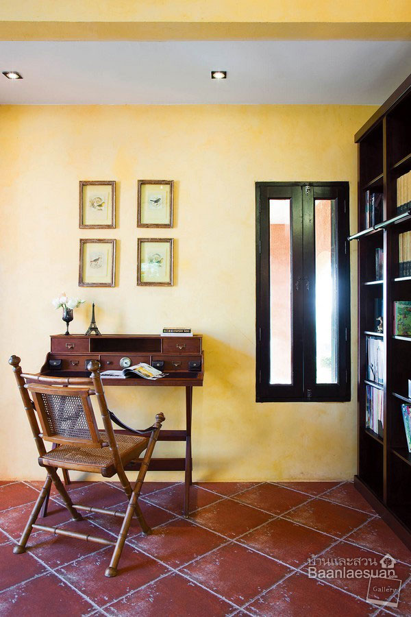ห้องทำงานห้องนี้ เลือกใช้สีเหลืองอ่อนทาผนังห้องตัดกับพื้นกระเบื้องสีส้มที่เล่นลวดลายด้วยการปูเฉียง และเลือกใช้เฟอร์นิเจอร์ไม้สีน้ำตาลเข้มในการประดับตกแต่งห้อง ทั้งเก้าอี้ไม้ โต๊ะไม้ ตู้หนังสือ รวมไปถึงบานหน้าต่าง ที่ให้สีตัดกัน แต่ดูลงตัว โดยรวมทำให้ห้องนี้มีกลิ่นอายของความคลาสสิค