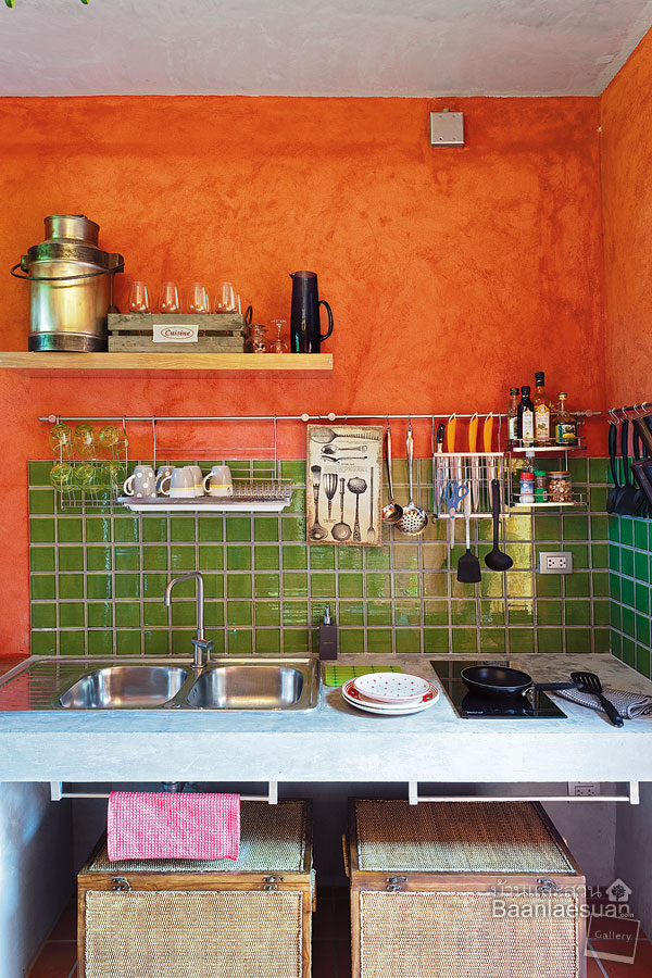 ผนังห้องครัวสีสันสดใส ผนังสีส้มนี้ถูกเติมแต่งด้วยกระเบื้องสีเขียวทำให้ดูมีชีวิตชีวา ด้วยการตัดกันระหว่างสีโทนร้อนและโทนเย็น เพิ่มเติมด้วยลังหวายเป็นที่เก็บของแบบลอยตัว สะดวกต่อการเคลื่อนย้ายได้ตามใจ