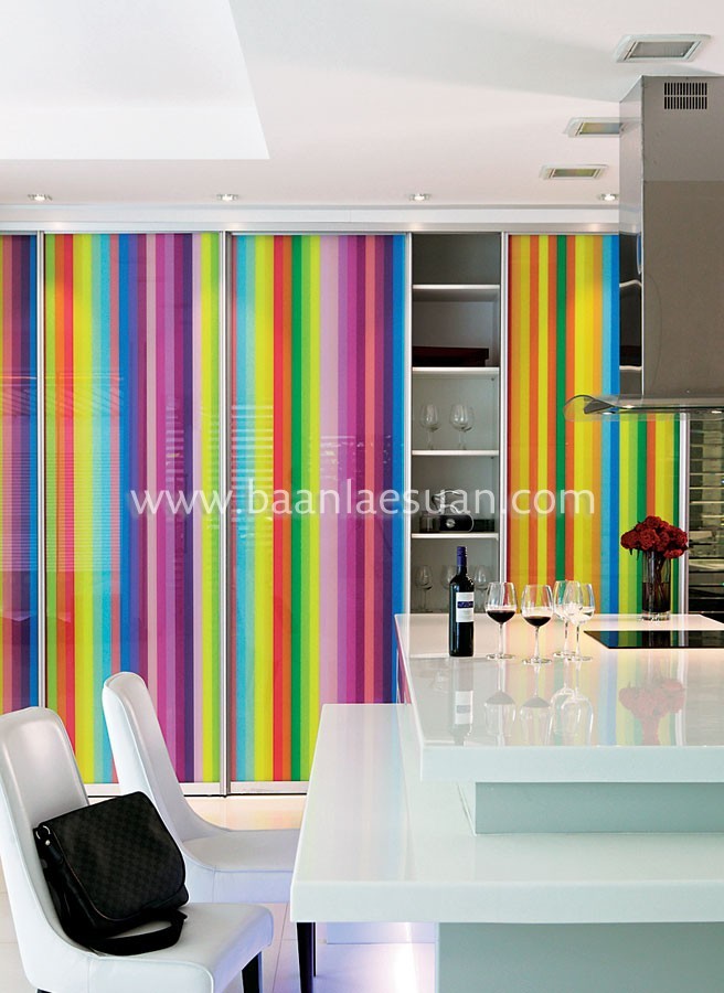 ห้องนี้้เป็นห้องที่เล่นสีกับผนัง โดยเลือกใช้หลากหลายสีและแต่ละสีก็เป็นสีที่มีความสดใส ทำให้ห้องดูมีชีวิตชีวา ไม่น่าเบื่อ ในขณะเดียวกันก็เลือกใช้เฟอร์นิเจอร์ที่มีสีขาว ซึ่งตัดกับความสดใส เพราะถ้าเลือกใช้เฟอร์นิเจอร์ที่มีสีอื่นหรือสีเข้มกว่านี้อาจทำให้ห้องดูเยอะเกินไป จึงควรใช้สีขาวเข้ามาช่วยลดความเด่นของสีให้เบาลง ทำให้บรรยากาศภายในห้องจะดูอึดอัดจนเกินไป