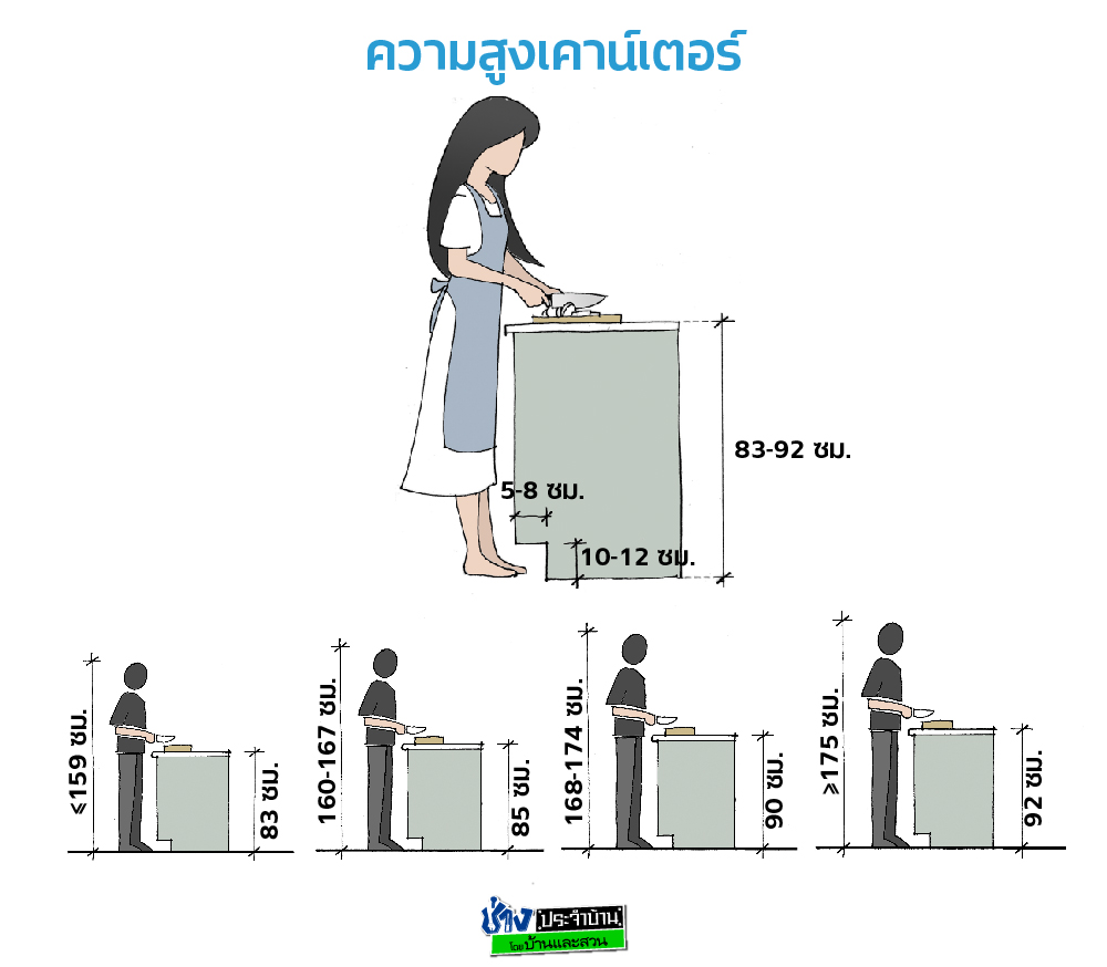 - ผู้ใช้สูงตั้งแต่ 175 เซนติเมตร เคาน์เตอร์ควรสูง 92 เซนติเมตร