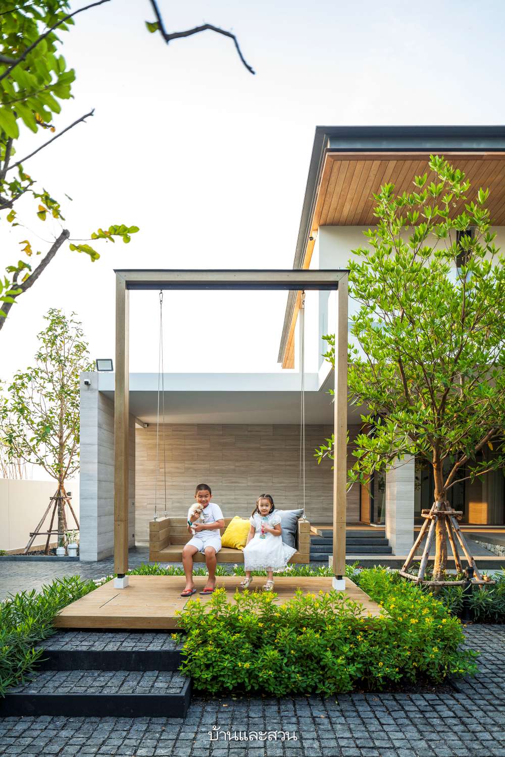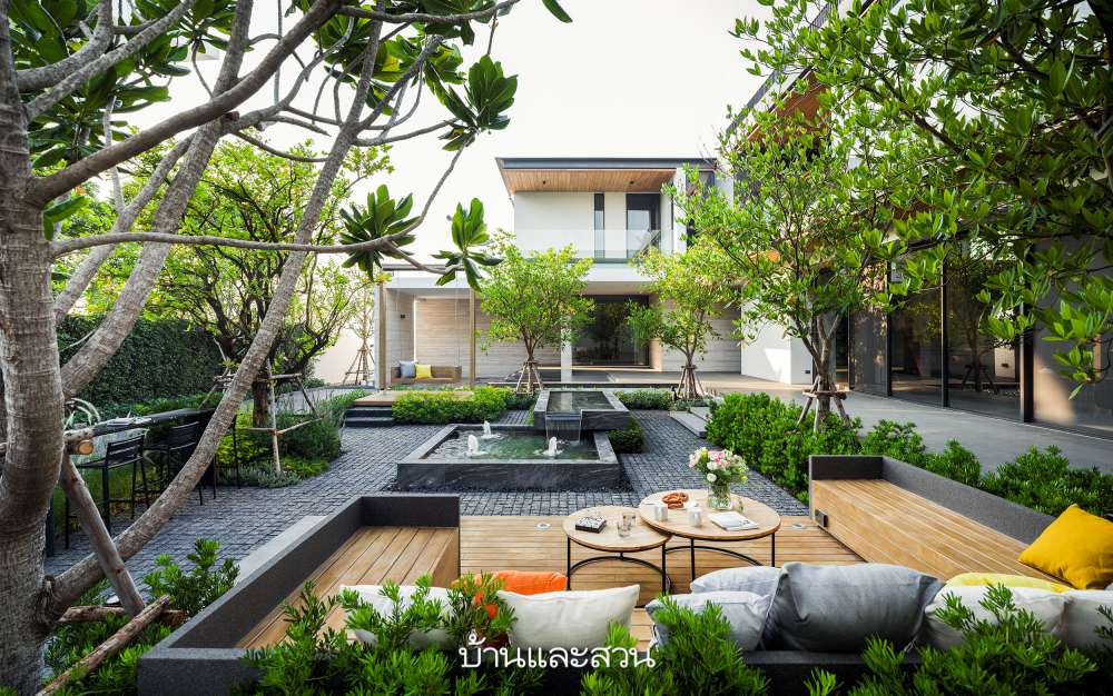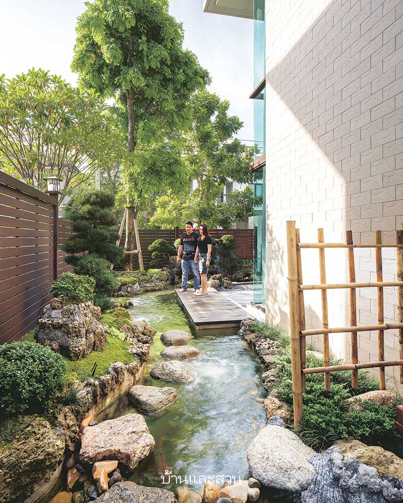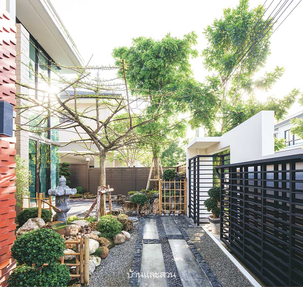 บ้านโมเดิร์นที่นำกลิ่นอาย สวนญี่ปุ่น มาใช้สร้างบรรยากาศร่มรื่น เด่นด้วยไม้ลำต้นฟอร์มสวย พื้นโรยก้อนหินเเละกรวดเเม่น้ำตามแบบอย่างของสวนหินญี่ปุ่น ก่อนจะแซมด้วยไม้ดอกโทนสีขาว-ชมพู พร้อมมุมนั่งเล่นพักผ่อนหลากหลายมุม