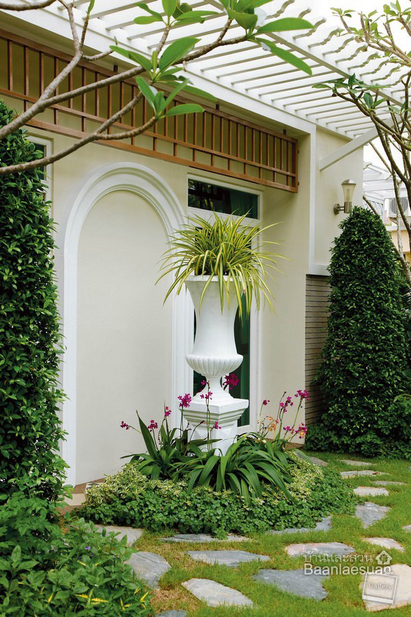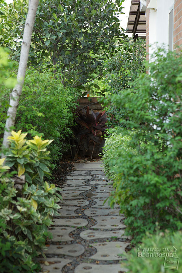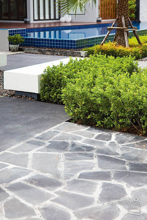 ปูพื้นสวนด้วยแผ่นหินปูพื้นที่มีลักษณะติดกันสำหรับเป็นทางเดินในสวน ช่วยให้บริเวณพื้นดูเป็นระเบียบและดูสะอาดตา ส่วนข้างทางเดินปลูกต้นไม้ทรงพุ่มเพิ่มพื้นที่สีเขียวแทนการปลูกหญ้า