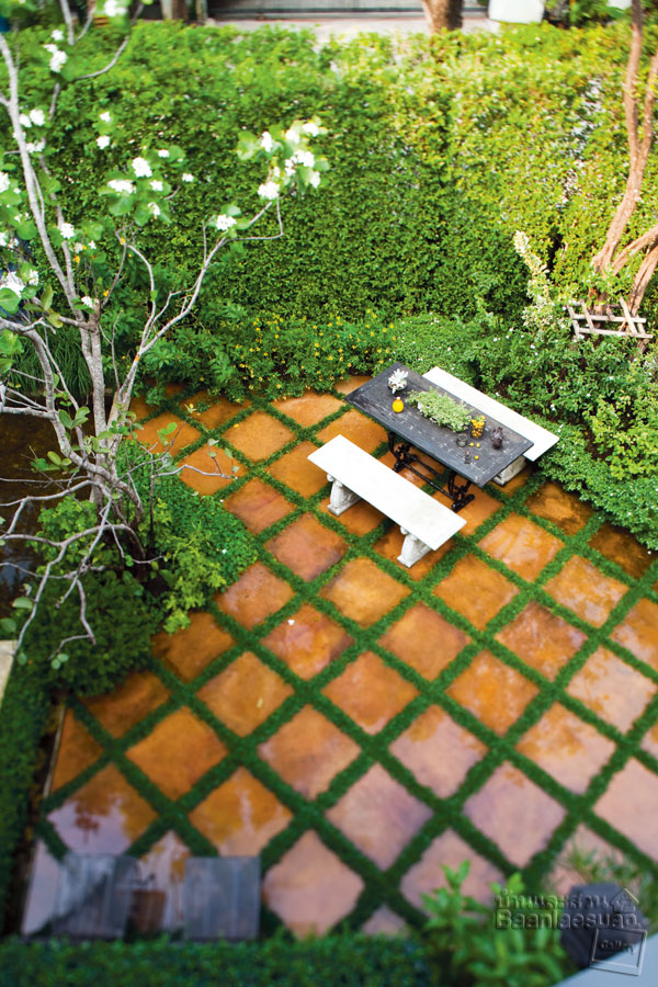 ปูพื้นสวน ด้วยกระเบื้องดินเผา เรียงกระเบื้องเฉียงให้แนวตรงกัน โดยมีการเว้นช่องว่างระหว่างกระเบื้องประมาณ 10 เซนติเมตร ปล่อยให้หญ้าแทรกตามช่องว่างที่มี สีของหญ้าและกระเบื้องดินเผาตัดกันได้ดี ทำให้พื้นที่ของสวนดูน่าสนใจมากขึ้น และทำให้การดูแลหญ้าง่ายขึ้นอีกด้วย