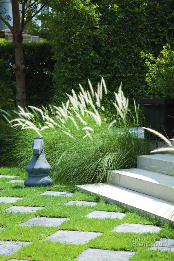 ปูพื้นสวนด้วยกรวดหิน และใช้แผ่นปูพื้นคอนกรีตปูให้เป็นทางเดิน เพิ่มลูกเล่นด้วยการวางเรียงแผ่นปูพื้นคอนกรีตให้สับหว่างกัน แบ่งสัดส่วนอย่างชัดเจนโดยปูหญ้าบริเวณด้านข้าง