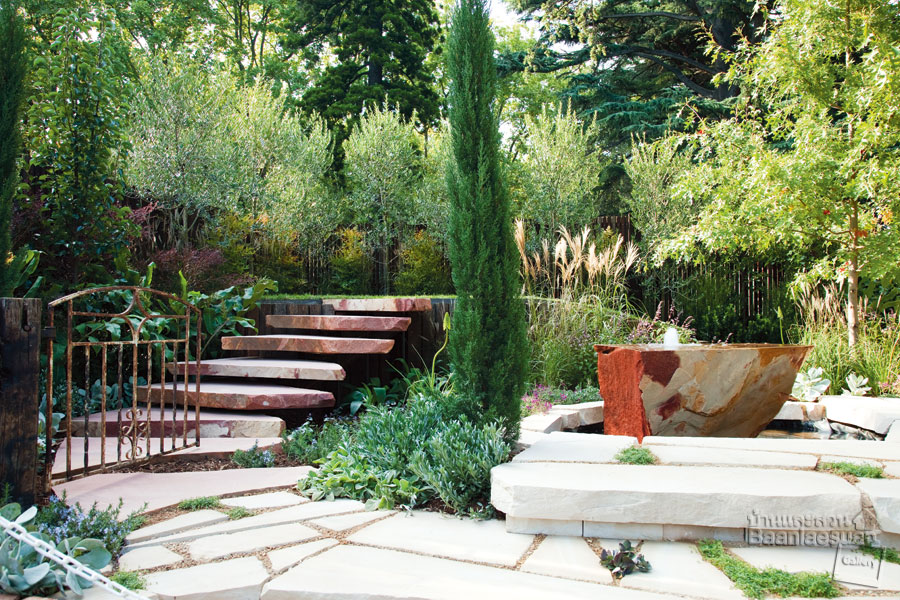 ใช้หินก้อนใหญ่ที่มีขนาดไม่เท่ากันปูเป็นทางเดิน เติมเต็มช่องว่างระหว่างรอยต่อด้วยกรวดหิน และแทรกด้วยไม้พุ่มเล็กๆเพิ่มสีสันให้ทางเดิน
