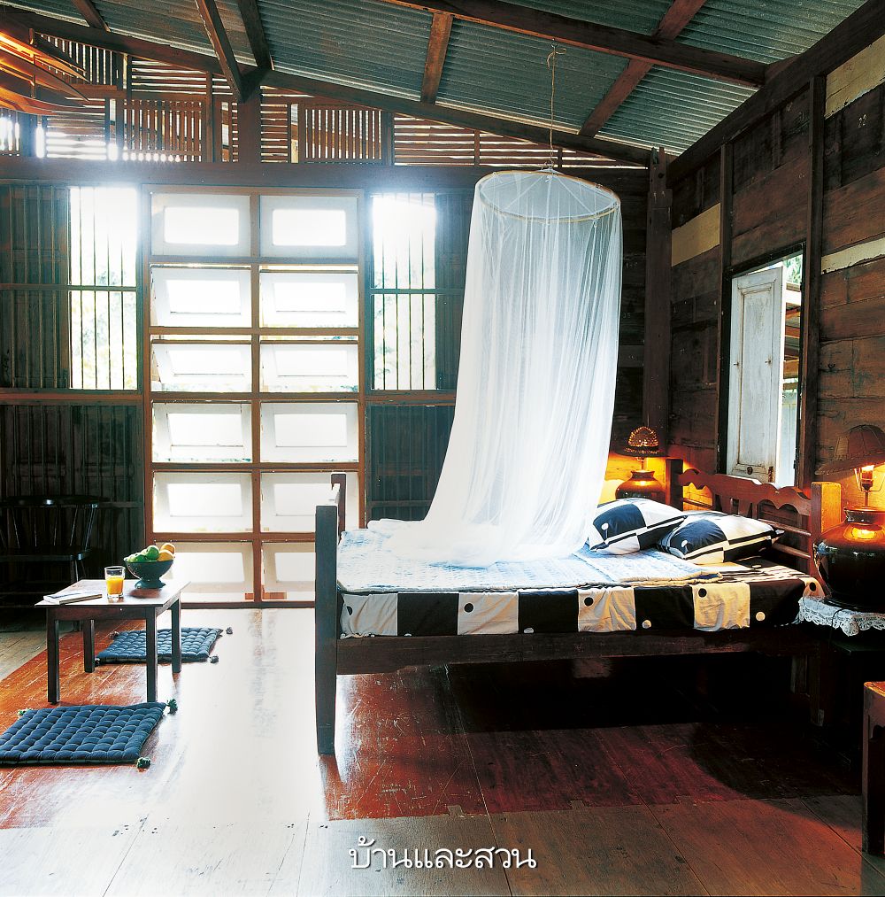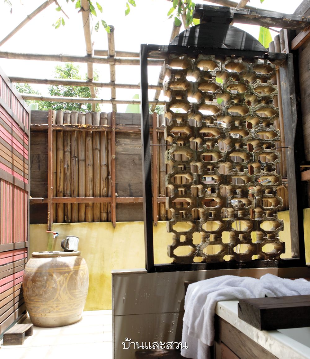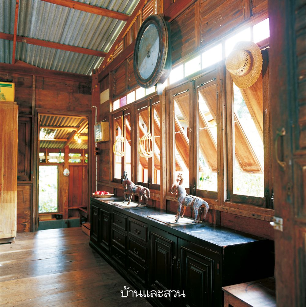 ภายในบ้าน คุณหนุ่มตกแต่งด้วยของเก่าที่หาซื้อได้ในตลาดละแวกบ้าน และใช้เฟอร์นิเจอร์ไม้ที่ดูเรียบง่ายผสมผสานกับวัสดุธรรมชาติและวัสดุเหลือใช้ที่ได้จากงานรับเหมาก่อสร้าง ซึ่งเป็นงานที่คุณหนุ่มเคยทำมาก่อน เมื่อนำทั้งหมดมาบวกเข้ากับไอเดียสนุกๆก็สามารถสร้างสรรค์พื้นที่เฉพาะตัว อย่างห้องครัวเรือนไม้ ห้องน้ำเปิดโล่ง หรือของตกแต่งอย่างโคมไฟประดิษฐ์ ที่ทั้งหมดล้วนสวยงามแปลกตา แต่ก็แฝงไว้ด้วยความสมถะแบบชาวบ้าน ทำให้บ้านดูร่มรื่นเป็นเอกลักษณ์ไม่ซ้ำใคร มองไปมุมไหนก็ดูผ่อนคลายสบายตา