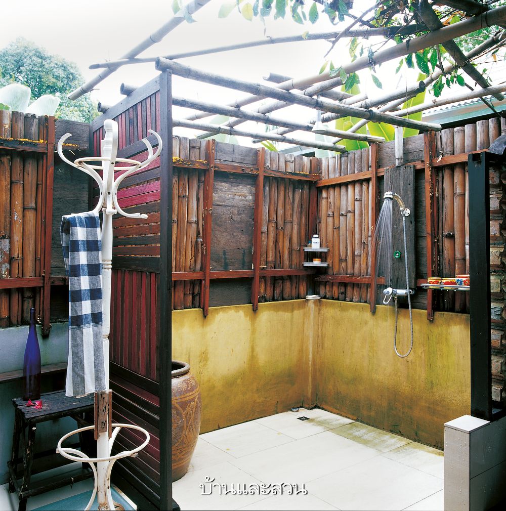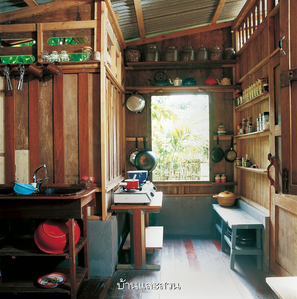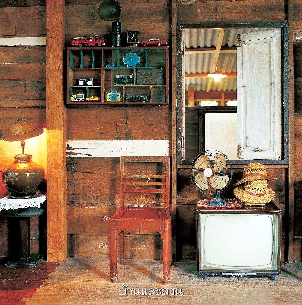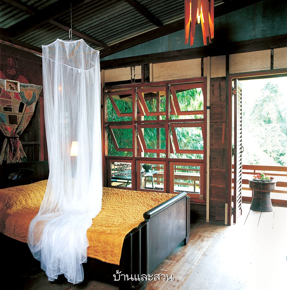 ภายในบ้าน คุณหนุ่มตกแต่งด้วยของเก่าที่หาซื้อได้ในตลาดละแวกบ้าน และใช้เฟอร์นิเจอร์ไม้ที่ดูเรียบง่ายผสมผสานกับวัสดุธรรมชาติและวัสดุเหลือใช้ที่ได้จากงานรับเหมาก่อสร้าง ซึ่งเป็นงานที่คุณหนุ่มเคยทำมาก่อน เมื่อนำทั้งหมดมาบวกเข้ากับไอเดียสนุกๆก็สามารถสร้างสรรค์พื้นที่เฉพาะตัว อย่างห้องครัวเรือนไม้ ห้องน้ำเปิดโล่ง หรือของตกแต่งอย่างโคมไฟประดิษฐ์ ที่ทั้งหมดล้วนสวยงามแปลกตา แต่ก็แฝงไว้ด้วยความสมถะแบบชาวบ้าน ทำให้บ้านดูร่มรื่นเป็นเอกลักษณ์ไม่ซ้ำใคร มองไปมุมไหนก็ดูผ่อนคลายสบายตา