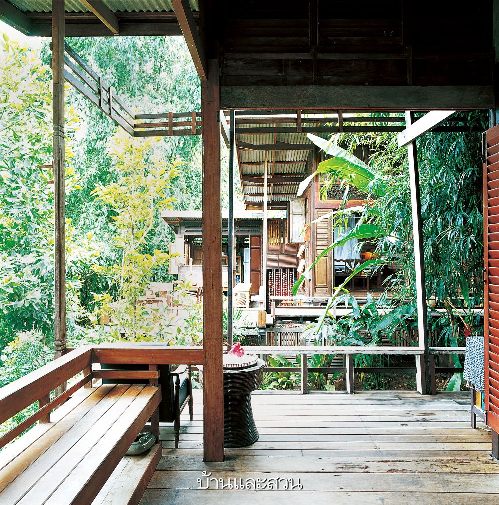 ออกแบบบ้านให้ยกพื้นสูงประมาณ 1-2 เมตร โดยไล่ระดับจากถนนทางเข้ามาจนถึงริมตลิ่ง เพื่อป้องกันน้ำท่วมในช่วงหน้าน้ำและเพื่อคงสภาพดินตามธรรมชาติไว้ เรือนไม้ทั้งสองหลังนั้นซื้อต่อมาจากบ้านเก่าที่กำลังรื้อทิ้งแล้วขนส่งนำชิ้นส่วนมาประกอบตกแต่งใหม่ตามความต้องการและเงื่อนไขของโครงสร้างเดิม โดยไม่ได้ตกแต่งผิวไม้เลยทำให้ได้บ้านที่มีบรรยากาศย้อนยุคพร้อมผิวสัมผัสอบอุ่นของไม้เก่าในสภาพเดิมจริงๆ