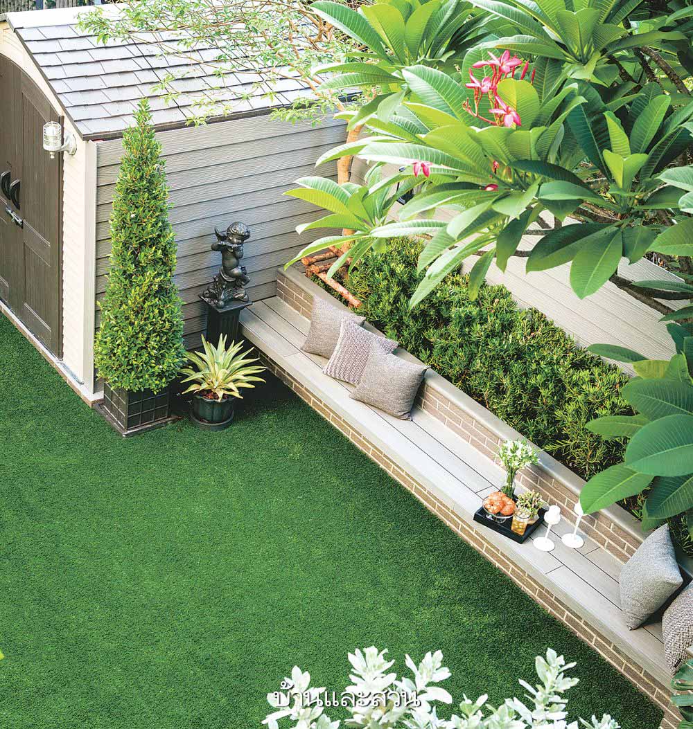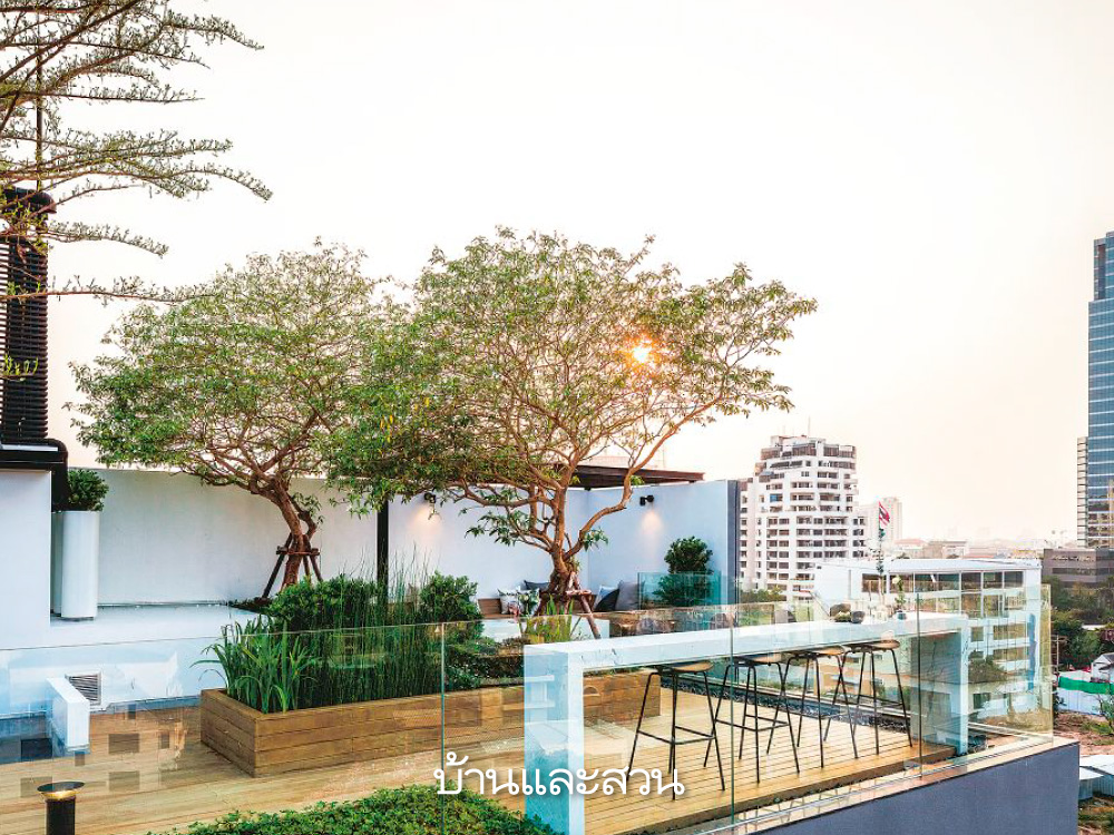 ดาดฟ้าของบ้านหลังนี้เป็นพื้นคอนกรีตทั้งหมดและมีการยกพื้นบางส่วนขึ้นมาแต่แรก พื้นที่ส่วนที่ยกสูงปรับเปลี่ยนใหม่โดยปูพื้นไม้เทียมเลือกใช้เฟอร์นิเจอร์เอาท์ดอร์แบบลอยตัวจาก IKEA ดูแลรักษาง่าย ตกแต่งด้วยไม้กระถางทั้งหมดเน้นไม้ขนาดกลางและเล็กเน้นจัดกลุ่มกันและเล่นระดับสูงต่ำ เลือกใช้พรรณไม้ชนิดที่ทนอากาศร้อนและแล้งได้ดี โดยเฉพาะกลุ่มแคคตัสและไม้อวบน้ำ ได้แก่ พญาไร้ใบ ลิ้นมังกร ยูฟอร์เบีย อโล ยุกกา อากาเว่ เป็นต้น รวมทั้งไม้ประดับอื่น ๆได้แก่ โอลีฟ กระดุมไม้ใบเงิน ไทรประดับ สนเกรวิลเลีย กราซีเนีย เป็นต้น ใช้กระถางดินเผา กระถางคอนกรีต และกระถางไฟเบอร์กลาส คุมโทนสีเรียบ ๆไม่ฉูดฉาด และมีมุมวางโต๊ะทำงานเล็กๆน้อย ๆในสวน >>> อ่านต่อได้ที่