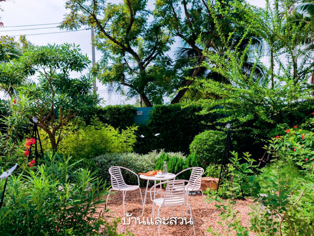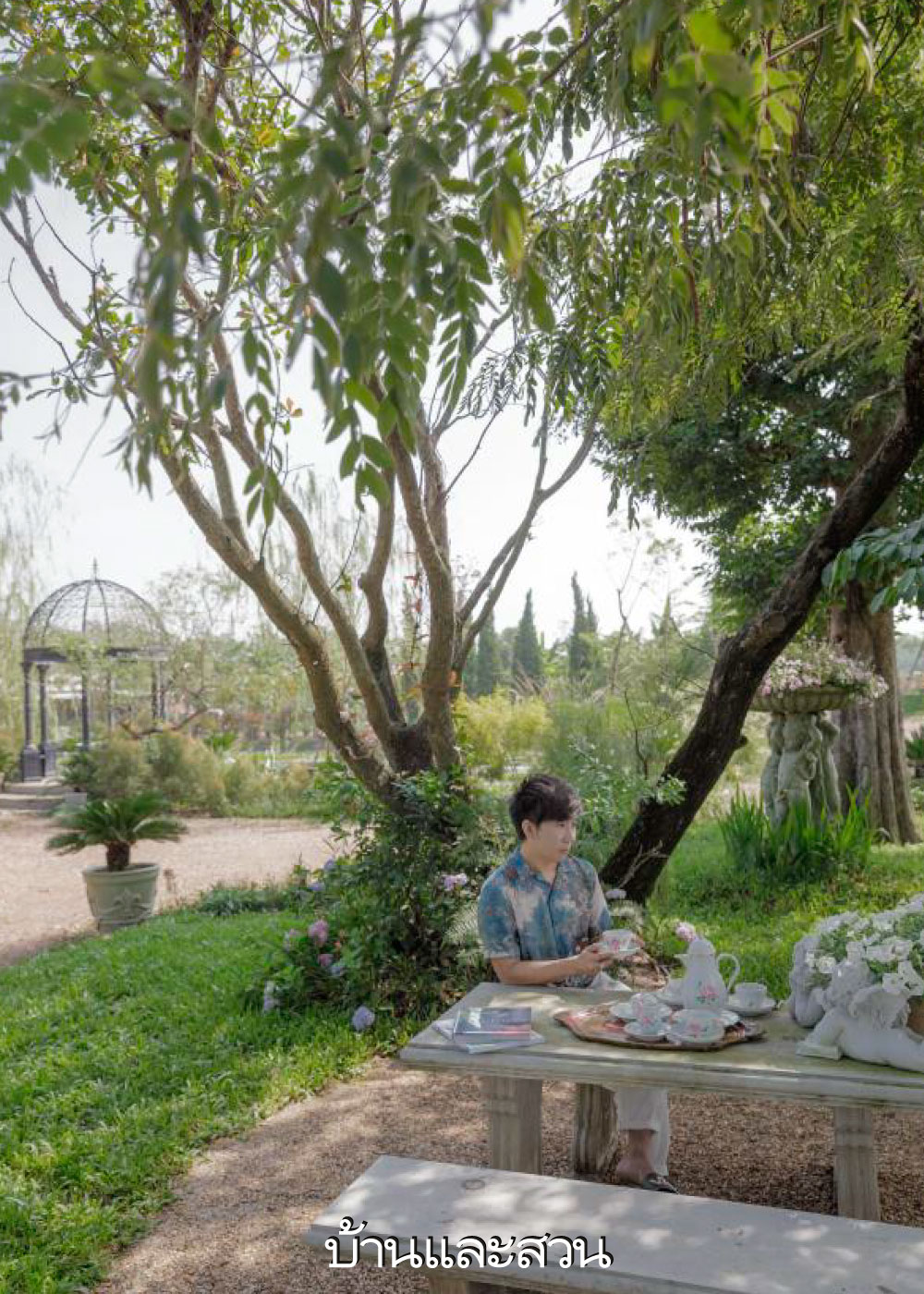 ใต้ร่มเงาของต้นไม้ใหญ่คือศิลปะการจัดวางและออกแบบสวนอย่างวิจิตรตระการตาด้วยฝีมือของ คุณโมช – ธนตพล พรมแพน และ คุณโจ – เฉลิมพล เฉลิมสุขดี สองนักจัดสวนมืออาชีพจาก Summersnow Home & Garden การจัดองค์ประกอบต่างๆภายในสวนโดยเฉพาะงานฮาร์ดสเคปและประติมากรรม ช่วยส่งเสริมให้สวนดูมีเอกลักษณ์และสร้างกลิ่นอายแบบสวนยุโรป โดยเมื่อผ่านประตูรั้วเข้ามาภายในบริเวณบ้านจะพบถนนลูกรังกว้างขวาง ขนาบด้วยแถวของกระถางเอิร์นวางเรียงรายไปตลอดทาง ซึ่งล้วนออกแบบให้มีเอกลักษณ์และรูปทรงที่พิเศษเฉพาะตัว ต่างจากกระถางเอิร์นที่ขายกันอยู่ในท้องตลาด ทอดยาวไปสู่ลานน้ำพุกลางสวนซึ่งออกแบบให้มีลักษณะเป็นลานพื้นหินยกระดับสูงขึ้นจากพื้นดินโดยรอบ พร้อมประดับประดาด้วยเสาไฟและรูปปั้น ซึ่งตกแต่งด้วยลวดลายปูนปั้นเถาองุ่นอย่างละเอียดและสวยงามไม่แพ้กัน สำหรับใช้เป็นมุมรับประทานอาหาร พื้นที่จัดเลี้ยง หรือเวทีที่จัดตามกิจกรรมและโอกาสต่างๆ >>>อ่านต่อได้ที่นี่